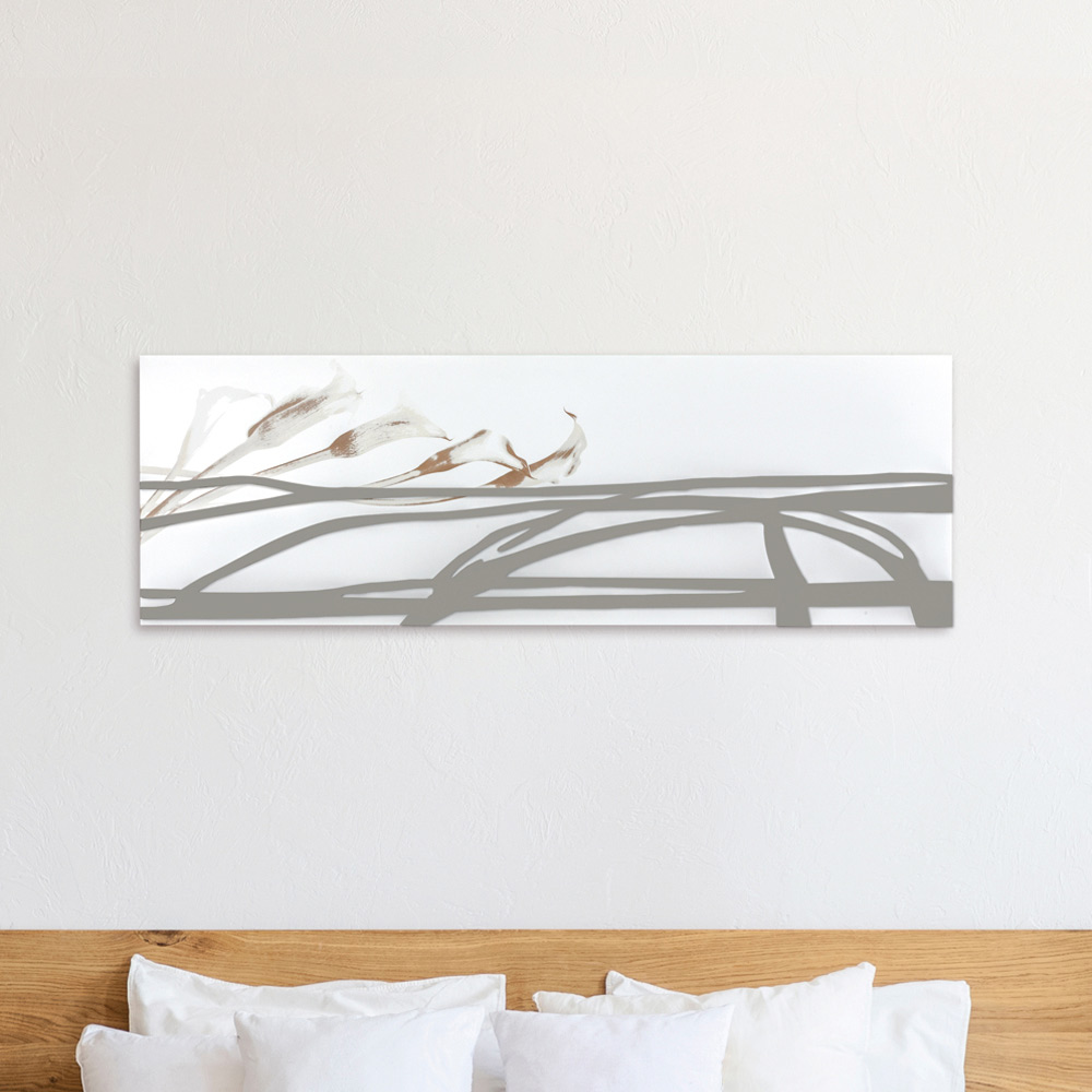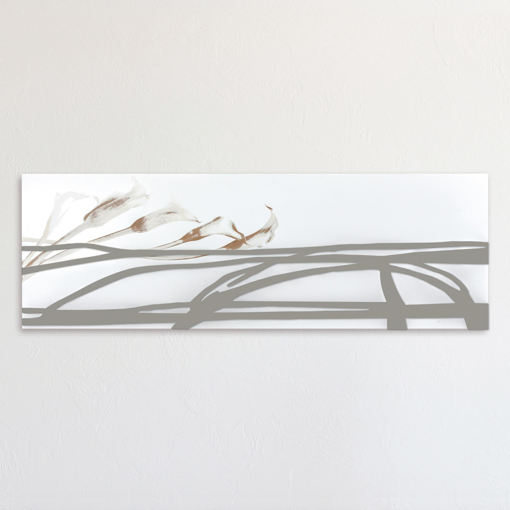 Het decoratieve paneel is gemaakt met behulp van de lasermarkeertechniek die een bas-reliëf op het materiaal creëert, waardoor verschillende kleurschakeringen op het paneel ontstaan. Het paneel is gemaakt van wit gelakt hout met kleikleurige applicaties. Het paneel is elegant en sober, dankzij de decoratie van gespiegeld plexiglas en de markering van de calla lelies.