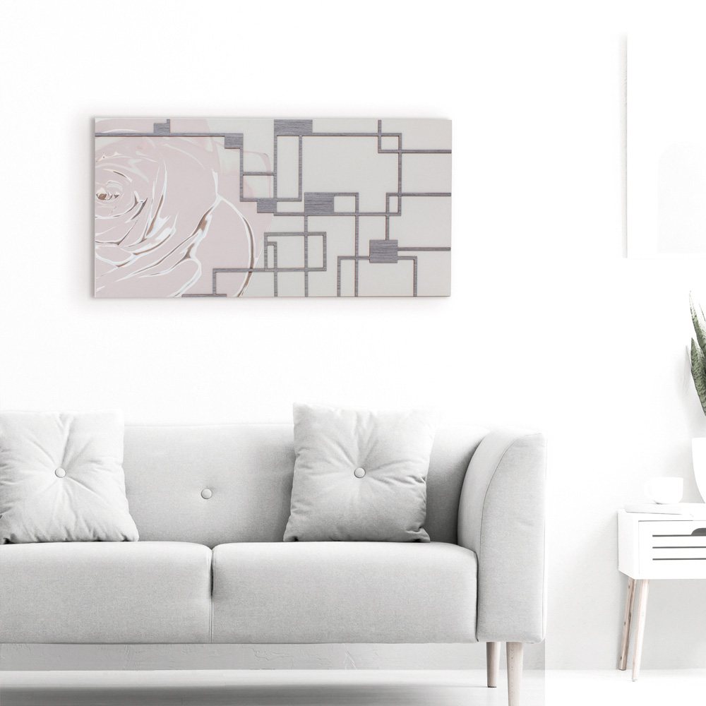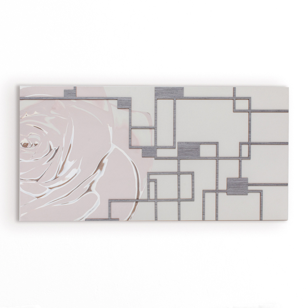 Het decoratieve paneel is gemaakt met behulp van de lasermarkeertechniek die een bas-reliëf op het materiaal creëert, waardoor verschillende kleurgradaties van de bloemblaadjes op het paneel ontstaan. Het frame is gemaakt van zandgelakt hout met grijze applicaties. Zachte roze tinten spelen met het geometrische decor in grijs hout.