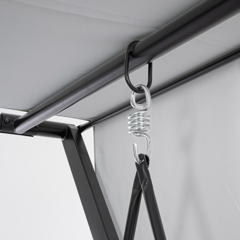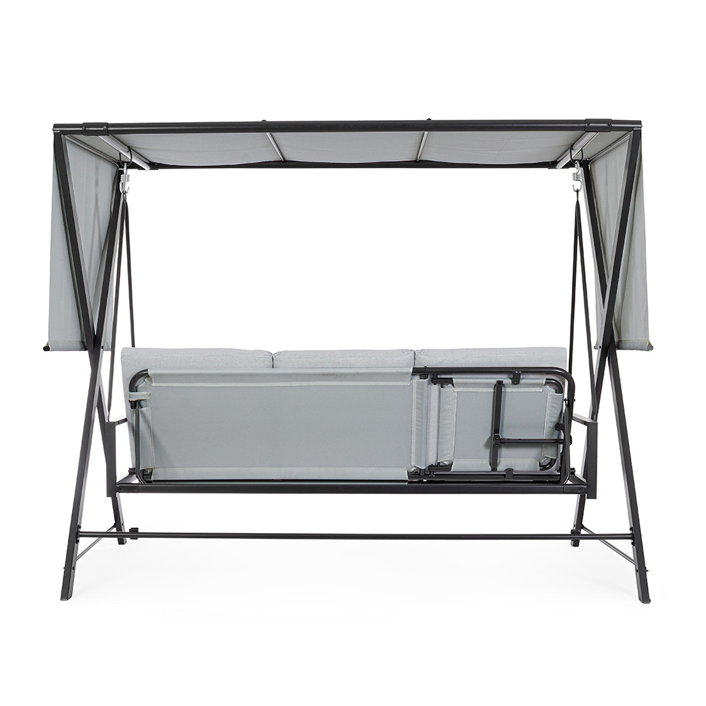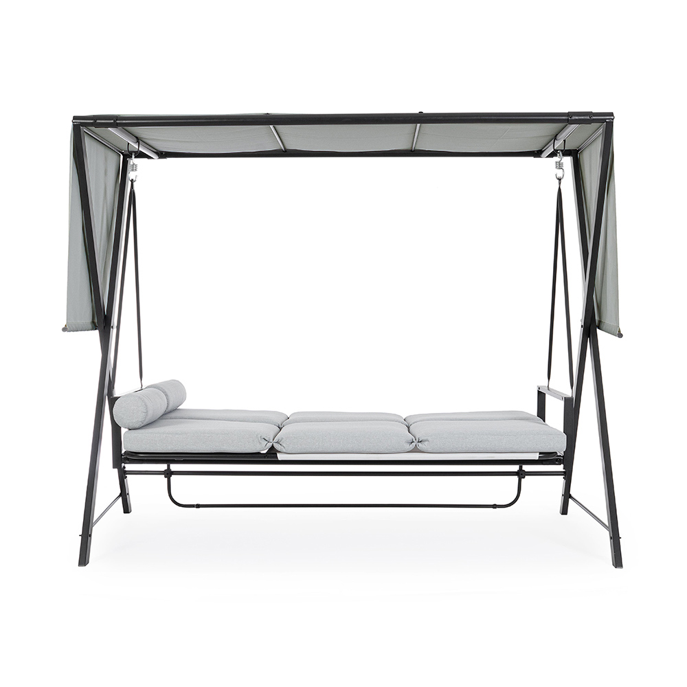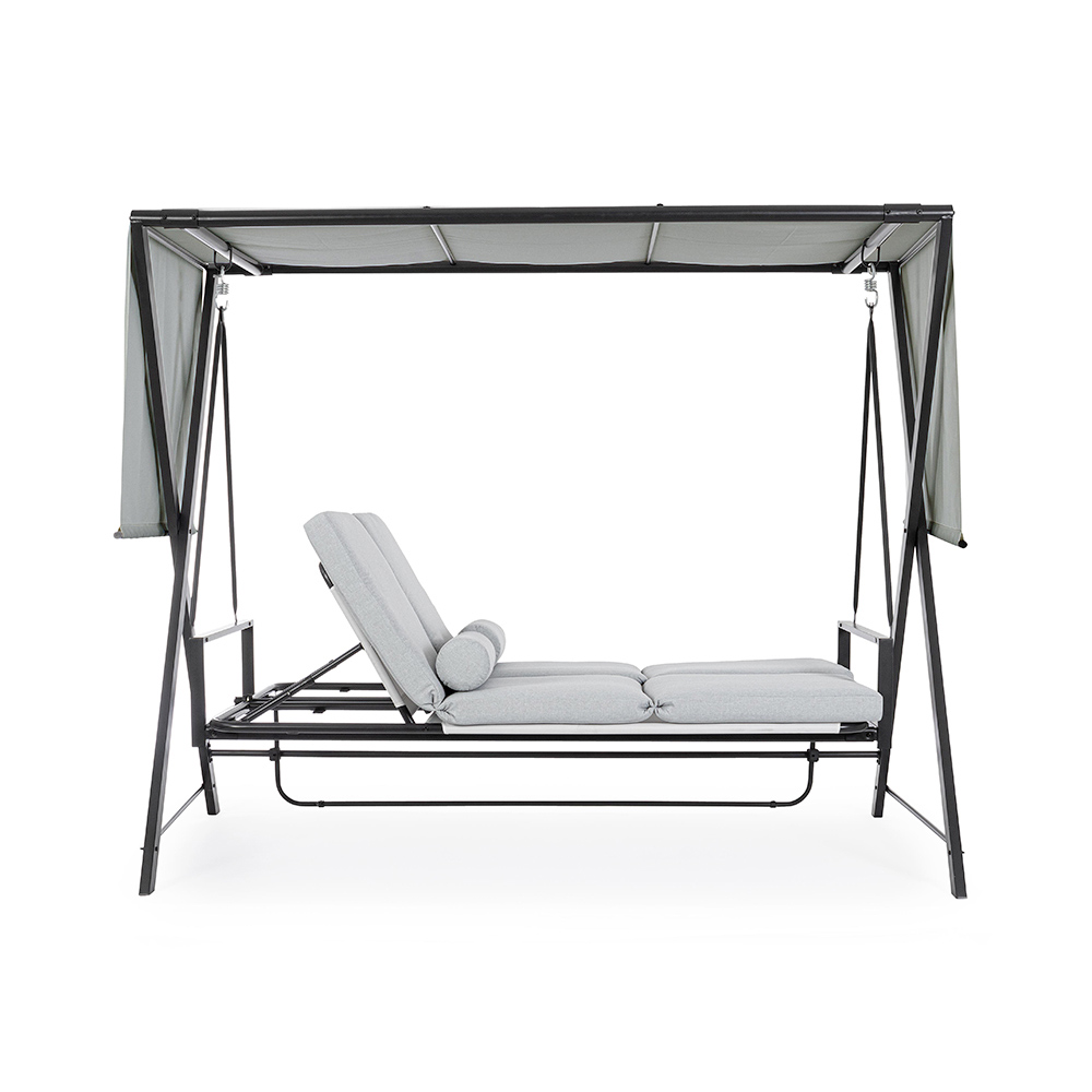 De verstelbare zonnekap biedt bescherming tegen de zonnestralen, waardoor u de schaduw naar wens kunt aanpassen, terwijl de zijgordijnen voor een vleugje privacy en extra bescherming zorgen. Deze schommel is meer dan alleen een zitje; het is een persoonlijk toevluchtsoord in uw tuin , een uitnodiging om even te ontsnappen aan de dagelijkse hectiek en het plezier van de tijd buitenshuis te herontdekken. Deze schommel is perfect voor wie op zoek is naar een hoekje van rust en stijl en is ideaal om de ontspanningservaring in uw buitenruimte naar een hoger niveau te tillen.