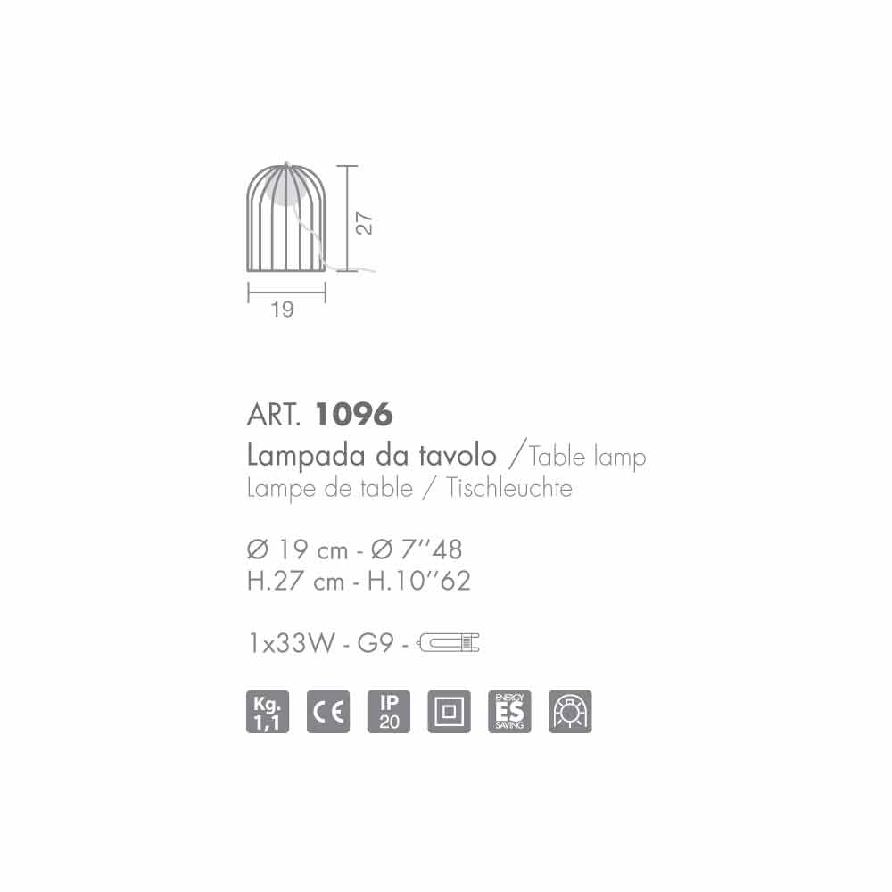 Kluvì is een tafellamp uit een metalen kooi en een bol in melkwit geblazen glas. Afwerking: gepolijst koper; voorbereid voor de 'utiizzo van 1 bol 33W - G9.