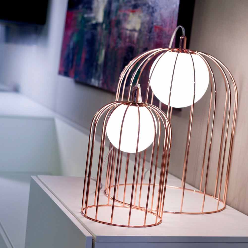 Kluvì is een tafellamp bestaat uit een metalen kooi en een bol in melkwit geblazen glas. Afwerking: gepolijst koper; voorbereid voor de 'utiizzo 1 70W - E27.