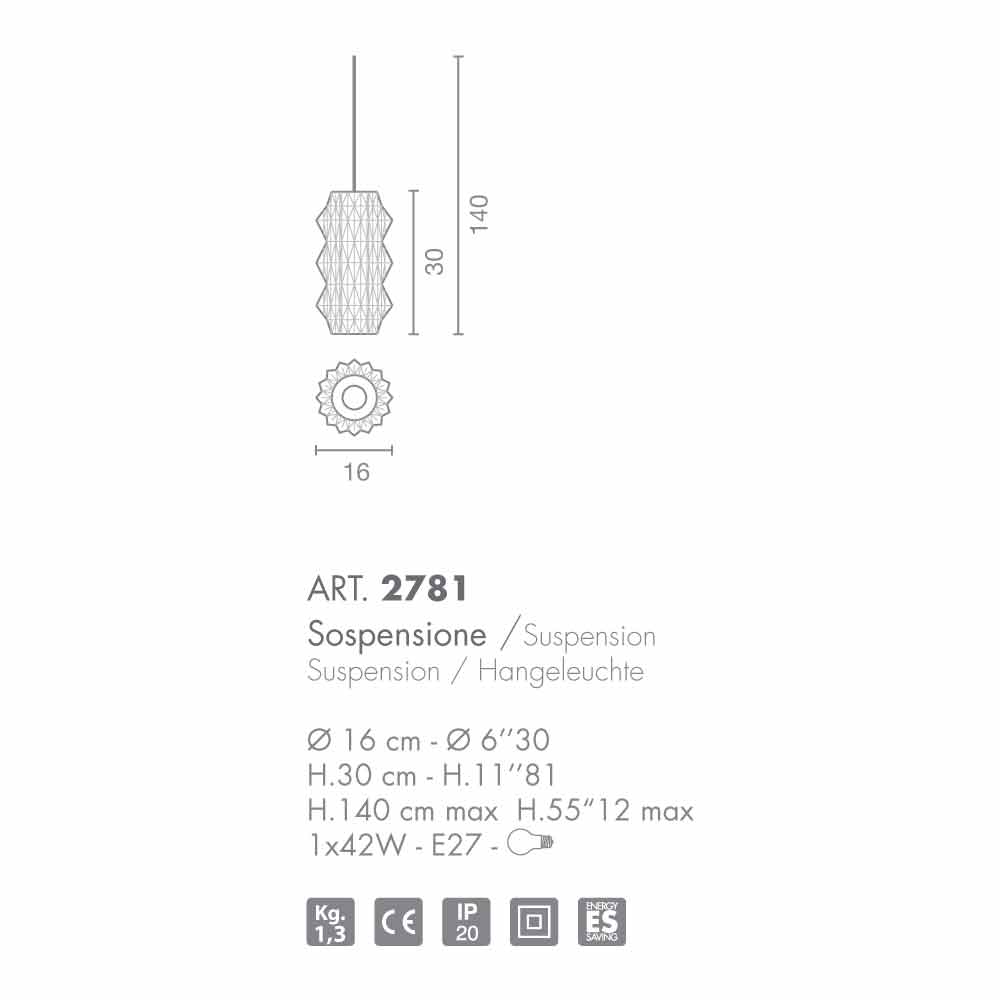 Origami is verdeeld in een hanglamp en een tafel, beide verkrijgbaar in diverse kleuren. Een collectie die voortkomt uit de omzetting van de Art Nouveau en de elegante lijnen en gestileerde in een mal om een geblazen glas vergelijkbaar met een 'kunstwerk te maken. Deze lamp is ontworpen voor het 'gebruik van 1 42W - E27.