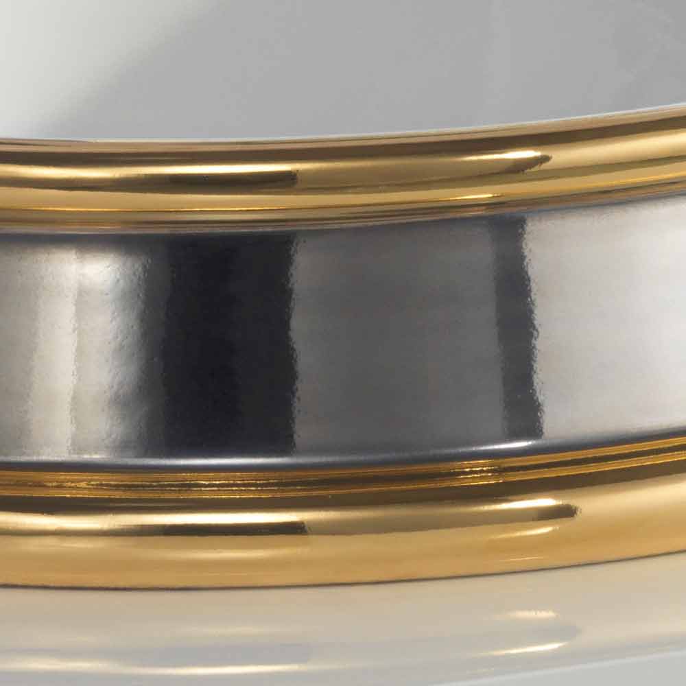 Gedeeltelijk badkamergootsteen gemaakt in Italië in vuurklei, handgemaakt, met streephand geschilderd in platina en ringen handgeschilderd met 24-karaats gouden afwerking.