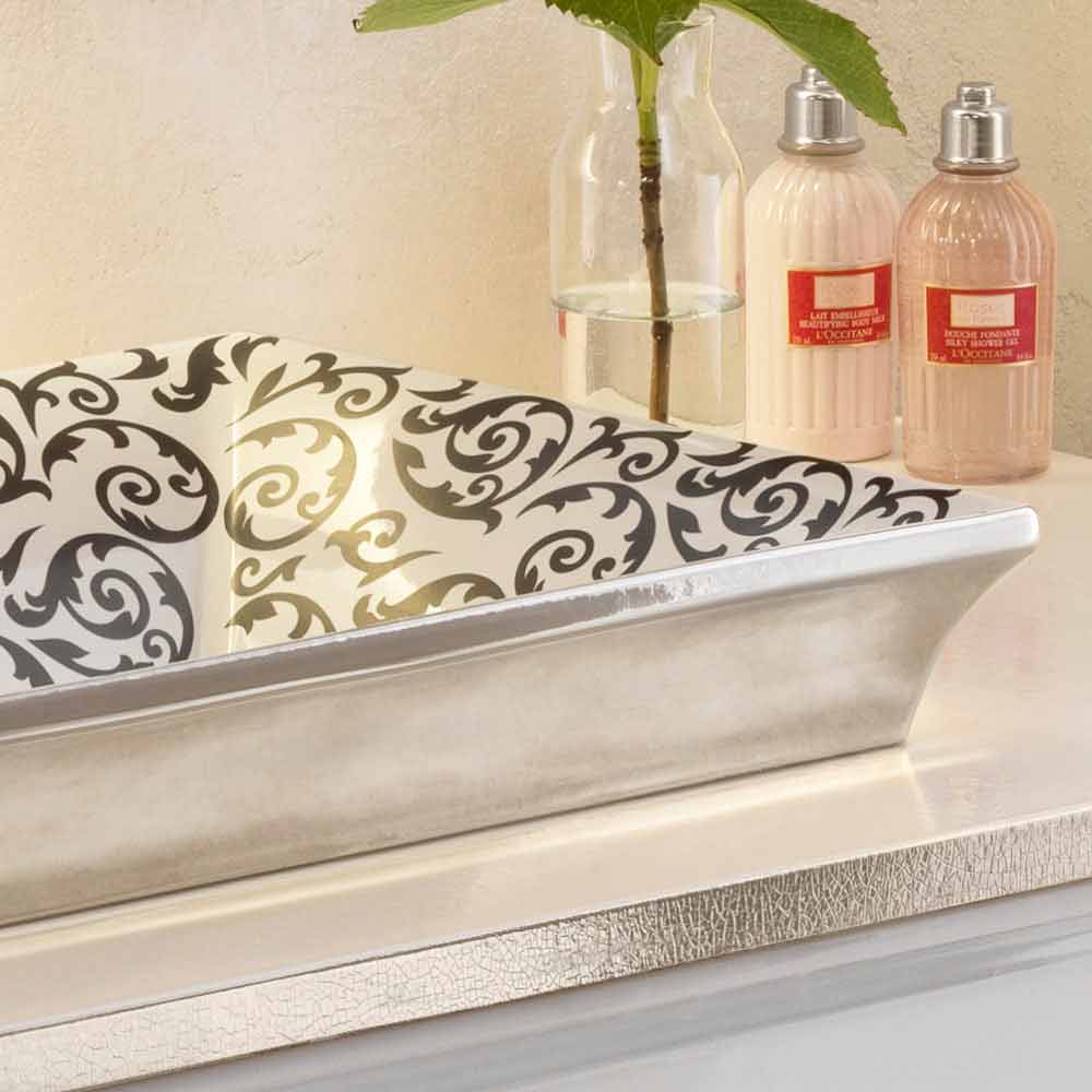 Badkamer semi-verzonken spoelbak gemaakt in Italië in vuur klei met handgemaakte sier bloemendecoraties aan de binnenkant en verfijnd in platina aan de buitenkant.