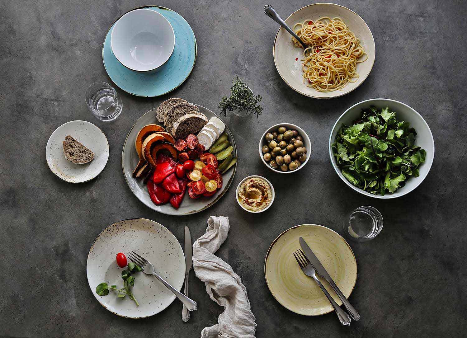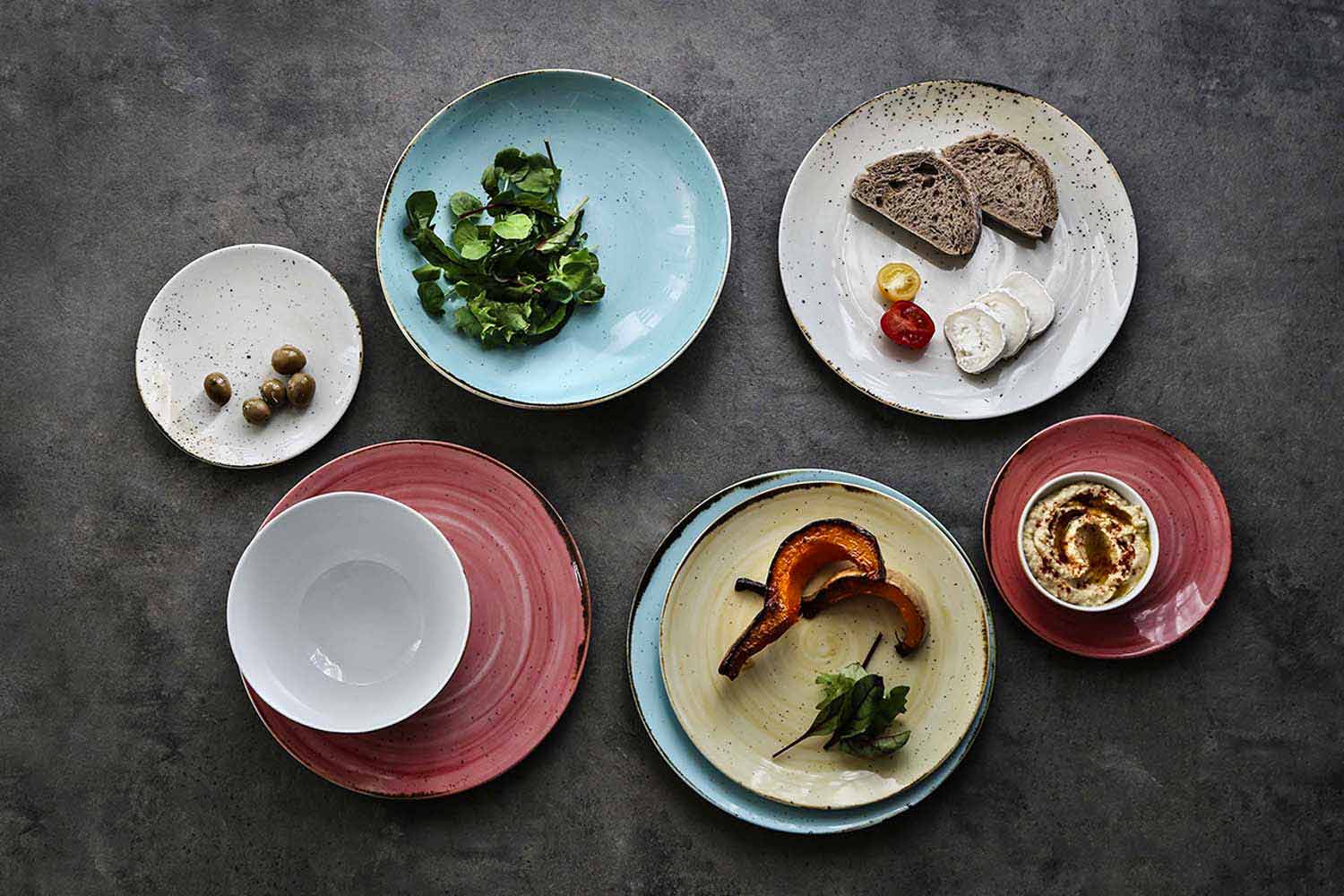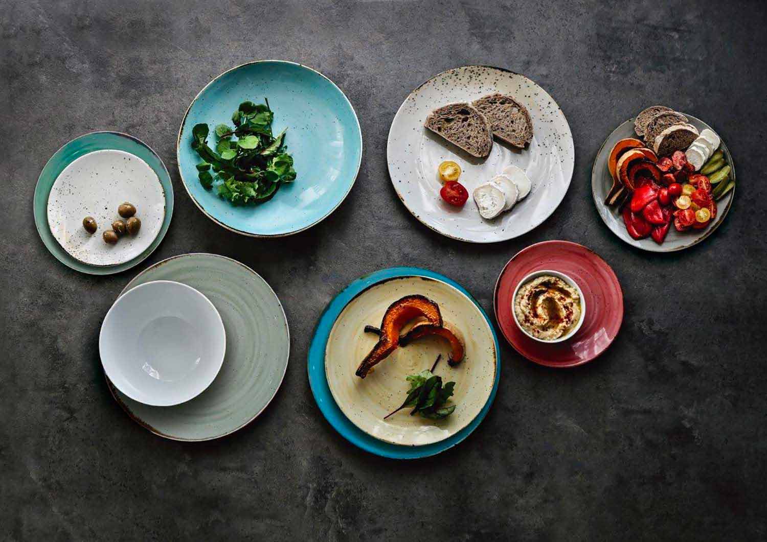 set dinerborden wordt gepresenteerd als eenvoudig, elegant en verfijnd, gemaakt van calcomania in verschillende kleuren, voor een rustieke en veelzijdige stijl.