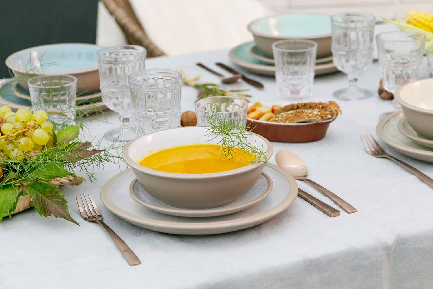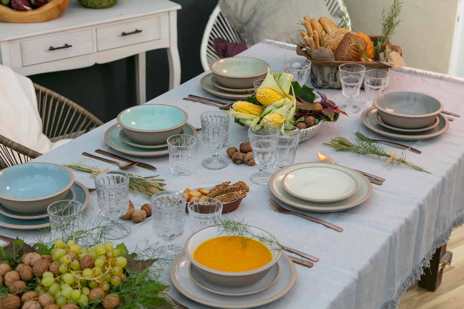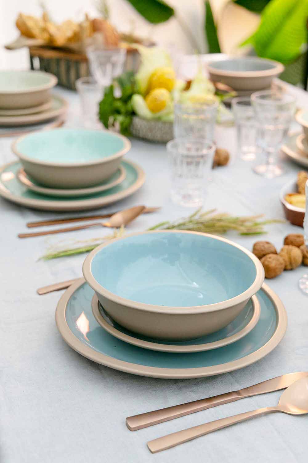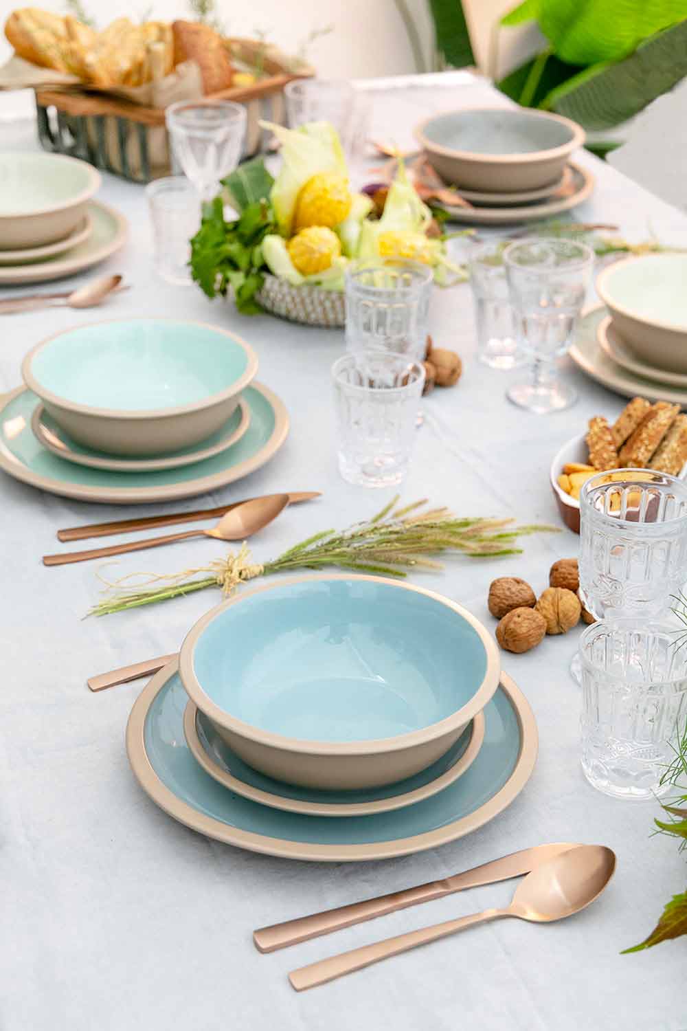 Dit servies met zachte en rustige kleuren kan een comfortabele en elegante sfeer creëren.