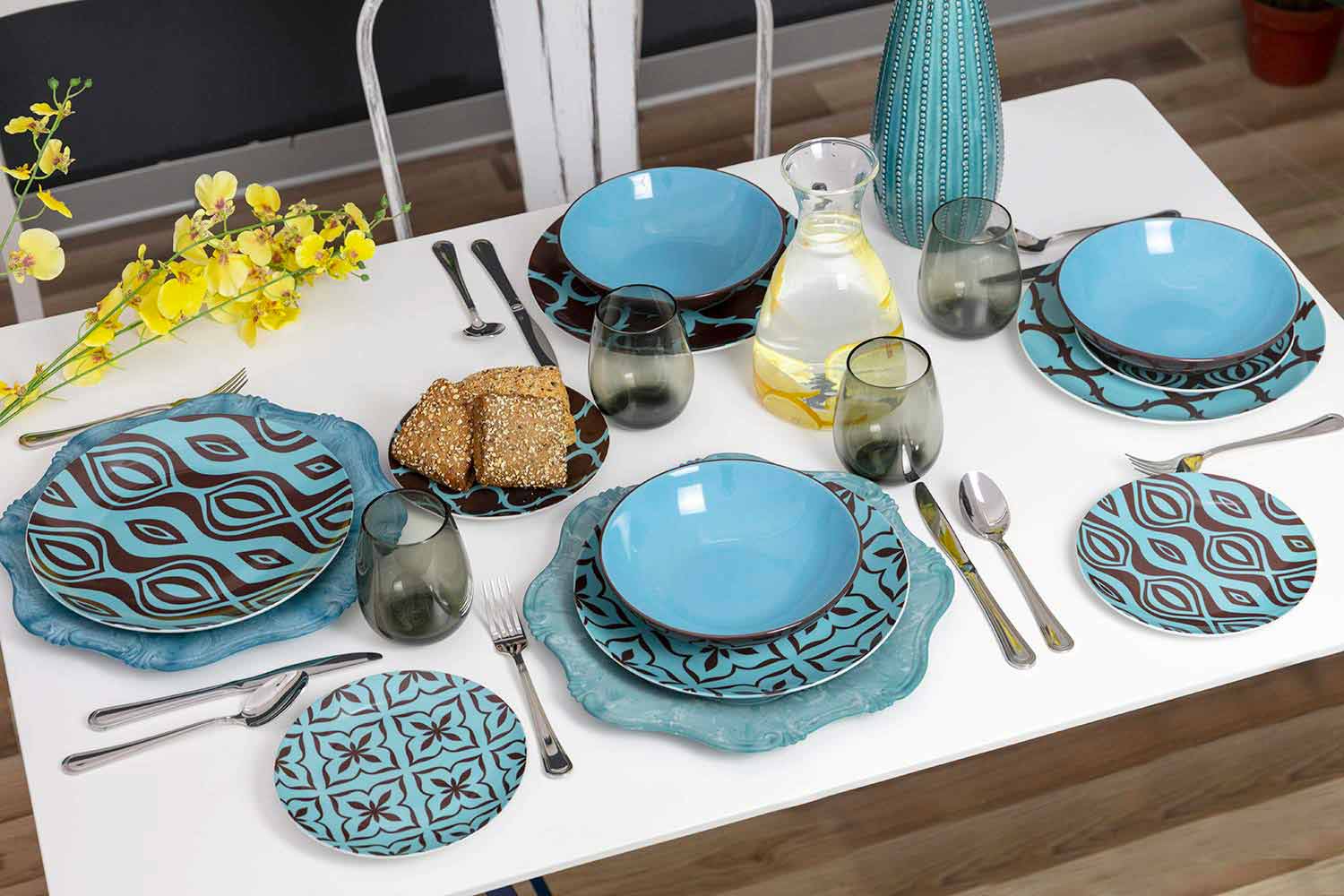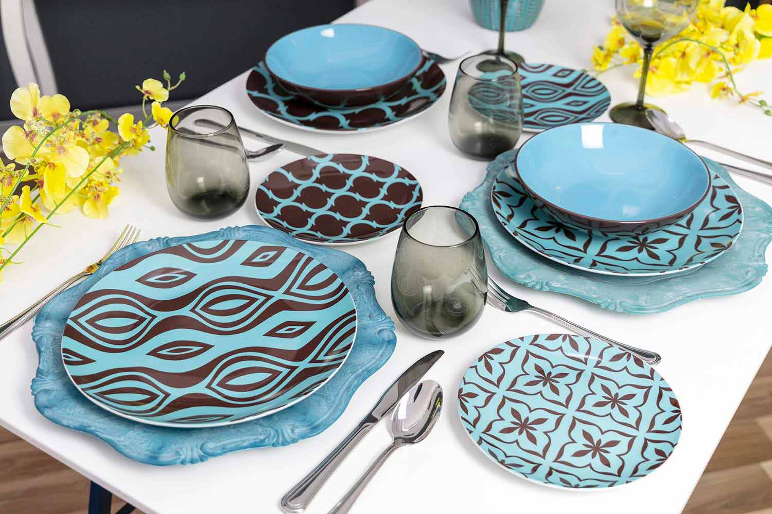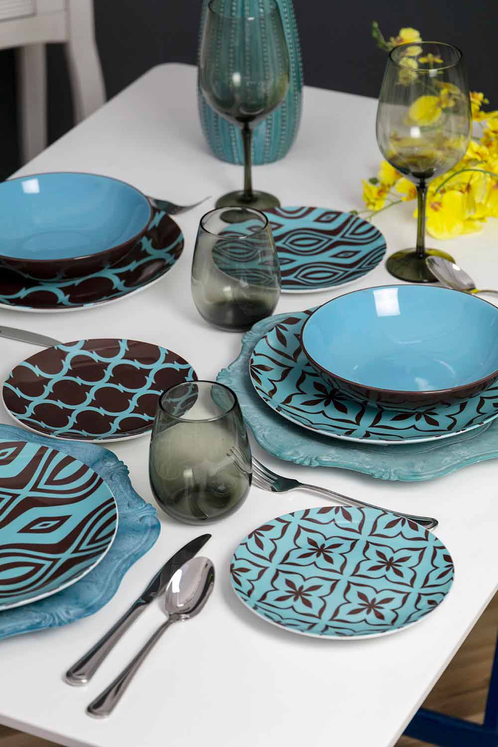 Compleet servies in porselein en steengoed, modern design bruin en lichtblauw 18 stuks.