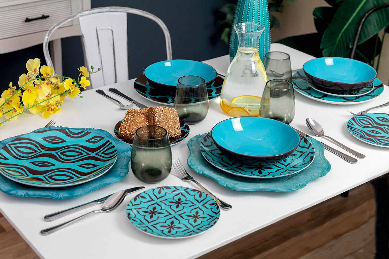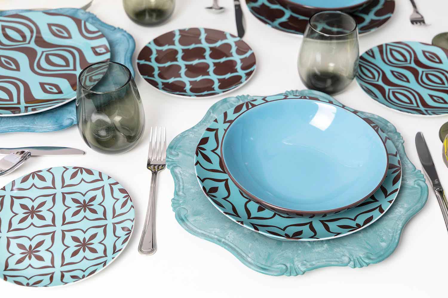 - 6 tafelplaatsen in 6 decoraties / kleuren verschillend van de andere gerechten uit dezelfde set