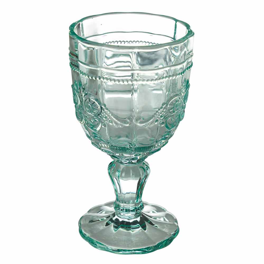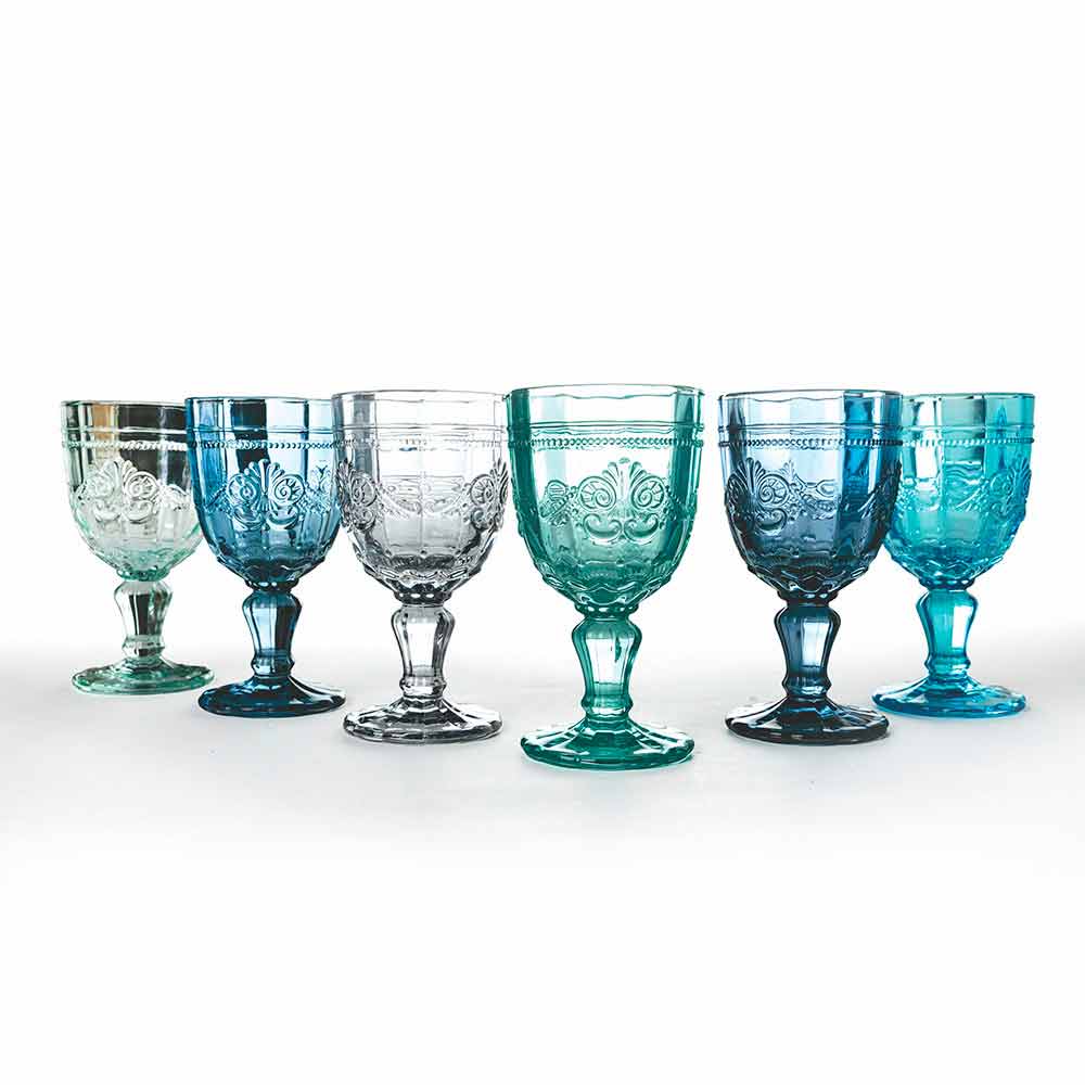 Gekleurde wijnglazen in glas met oosterse versieringen, 12 stuks.