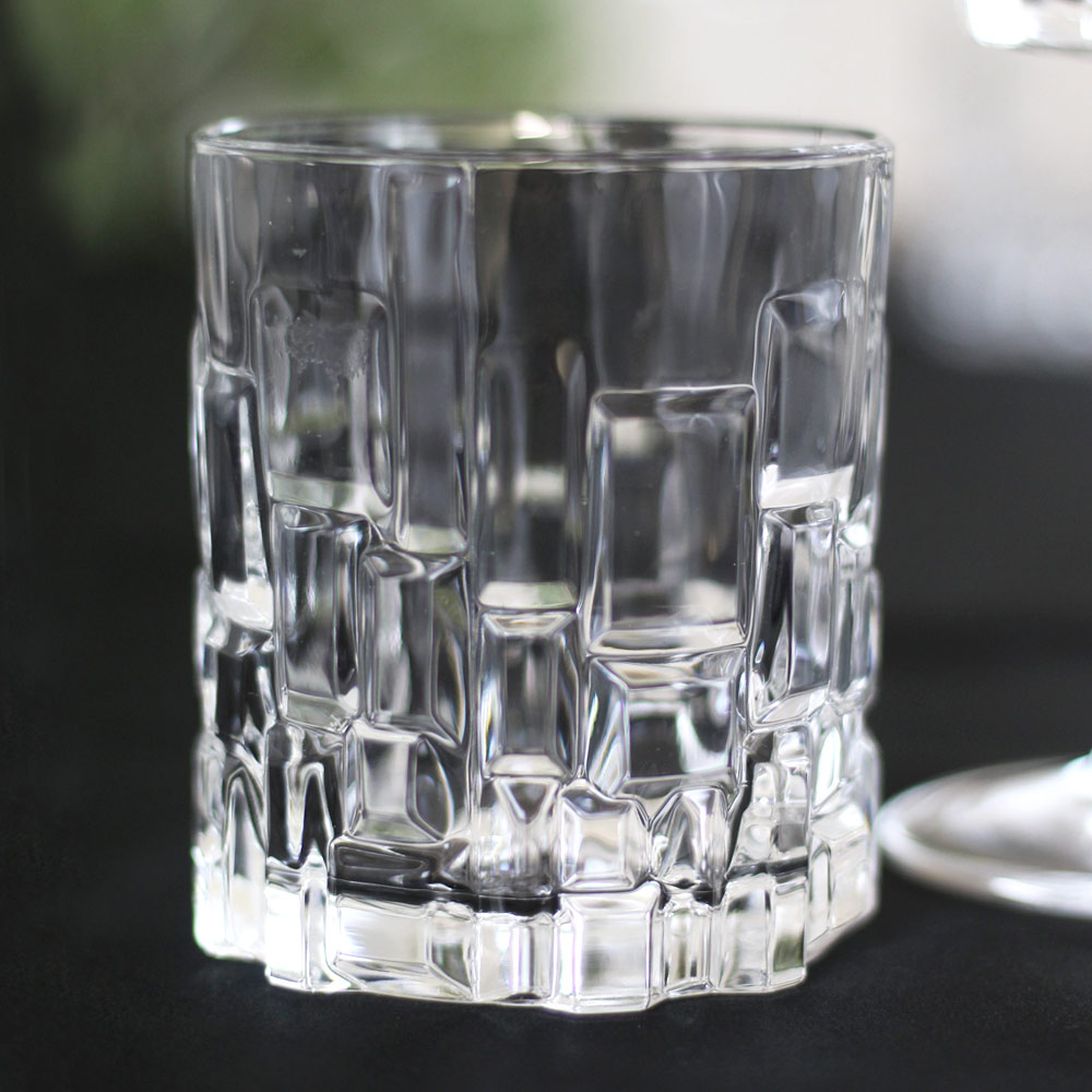 De glazen, met een moderne en verfijnde stijl, hebben een origineel gaaspatroon van onderling verbonden vierkanten. Perfect om uw tafel te verfraaien met een vleugje unieke stijl, ze combineren schoonheid, duurzaamheid en functionaliteit .