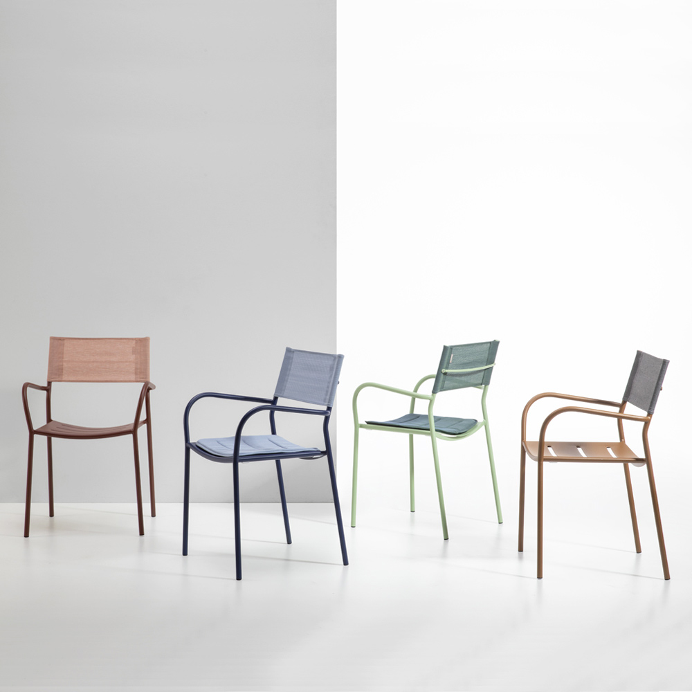 De ergonomische zitting met golvende lijnen zorgt voor uitstekende ondersteuning en comfort, terwijl de ademende Batyline-rugleuning superieur comfort biedt, zich perfect aanpast aan de lichaamsvorm en de luchtcirculatie bevordert, zelfs op de warmste dagen. De afgeronde armleuningen zorgen voor een vleugje verfijning en maken de stoel nog comfortabeler voor aangename momenten van ontspanning buitenshuis.