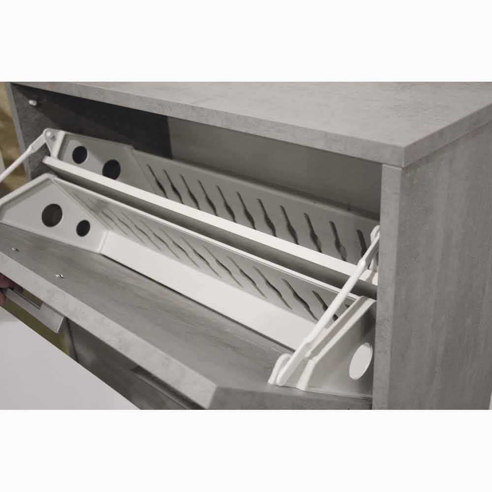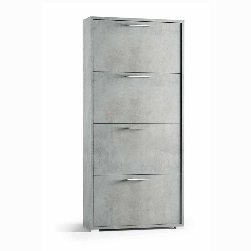 Senis is een schoenenrek op de voorgrond, met een modern en elegant design.