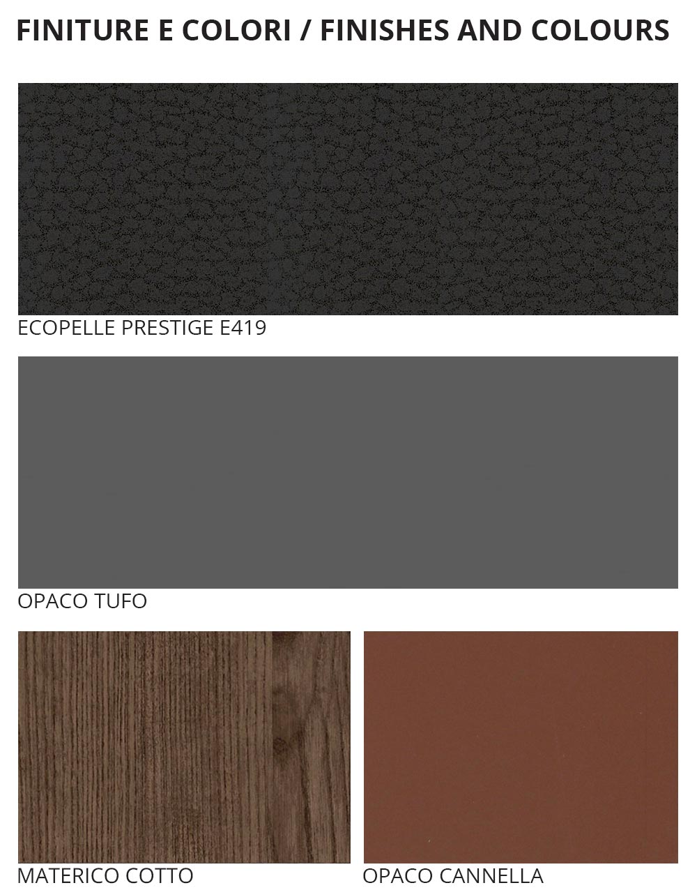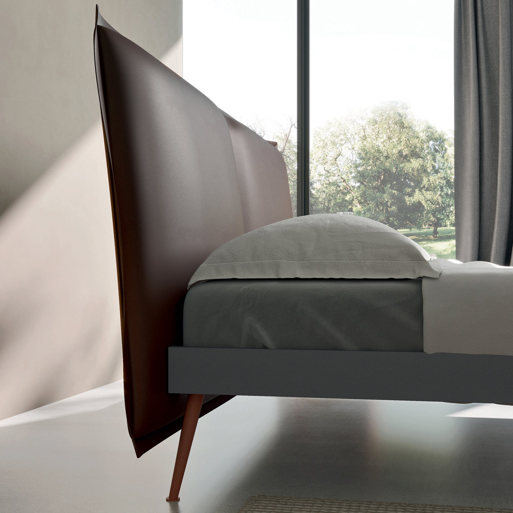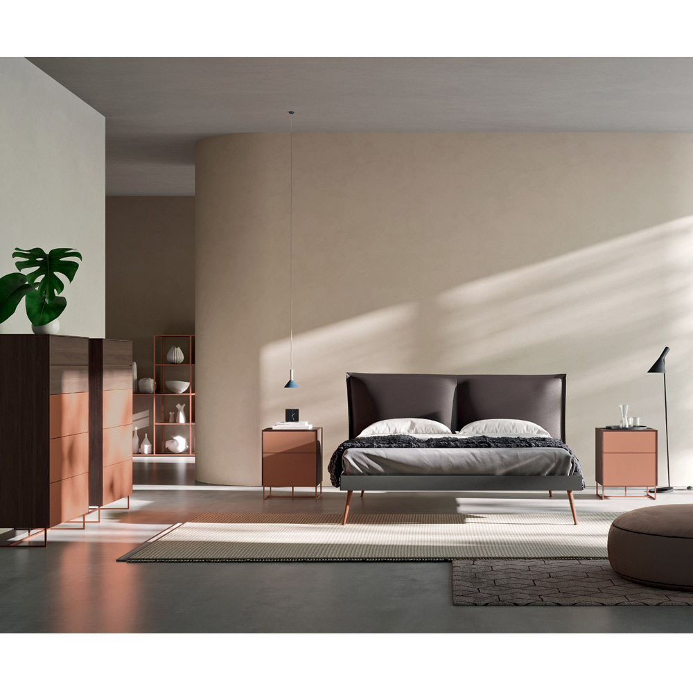 eco-leer en poten in kaneel gelakt hout, twee nachtkastjes (2 laden) en twee ladekasten (5 laden) in dezelfde kleur als de poten van het bed verrijkt met details in getextureerde terracotta afwerking. Van de bijzondere aandacht voor details en de