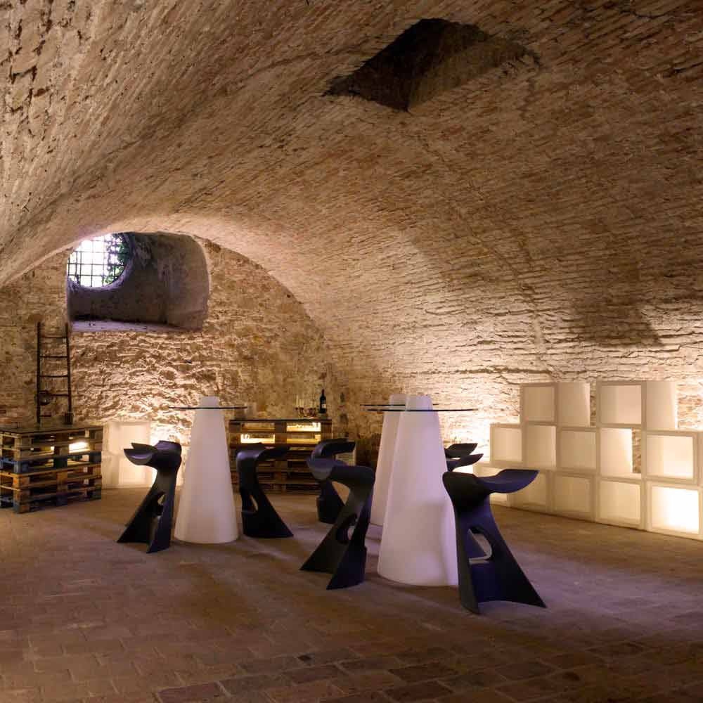 Het bestaat uit een conische basis van polyethyleen en een rond blad van gehard glas. Een niet onverschillige bijzonderheid is het centrale flessenvak, een detail dat bij speciale gelegenheden het verschil kan maken.