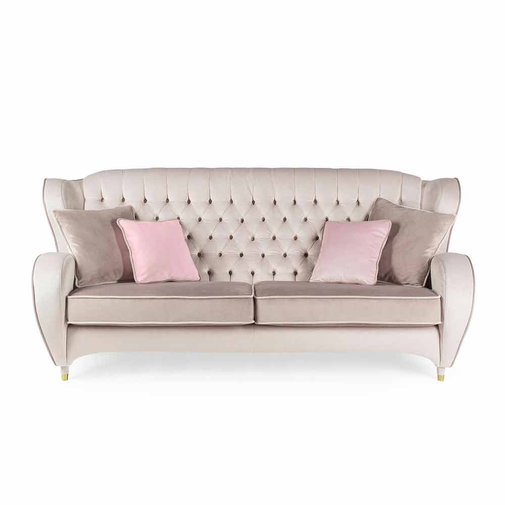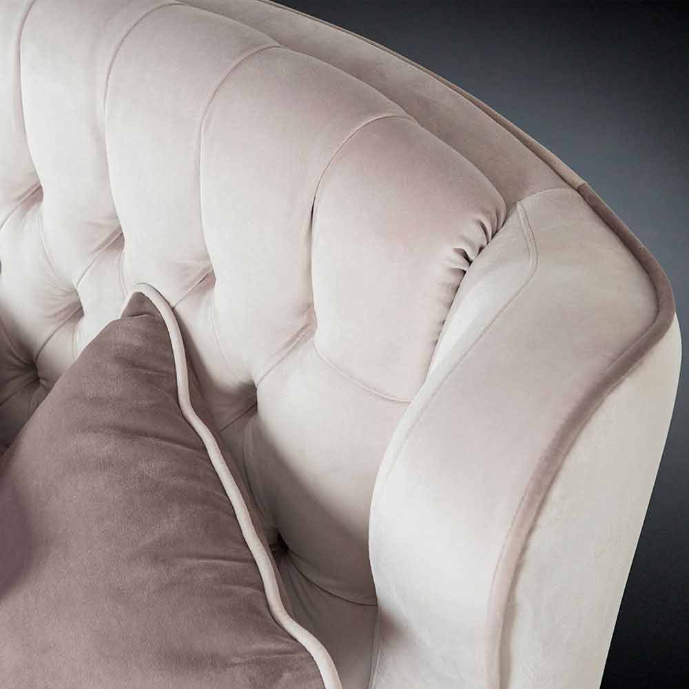 De bijzonderheid van deze bank is ingekapseld in zijn kostbare coating glad en zacht fluweel, uit fijne nuances ecru Tortora rand en dakgoot. New Classic stijl bank met hoge rug in capitonnè.