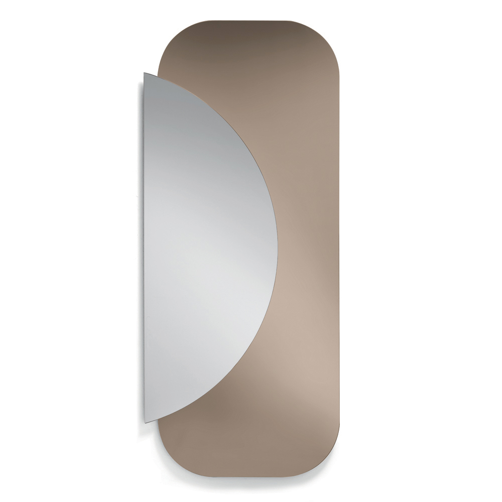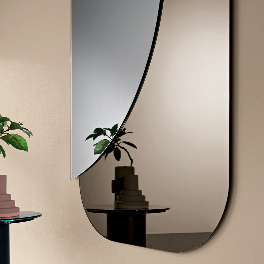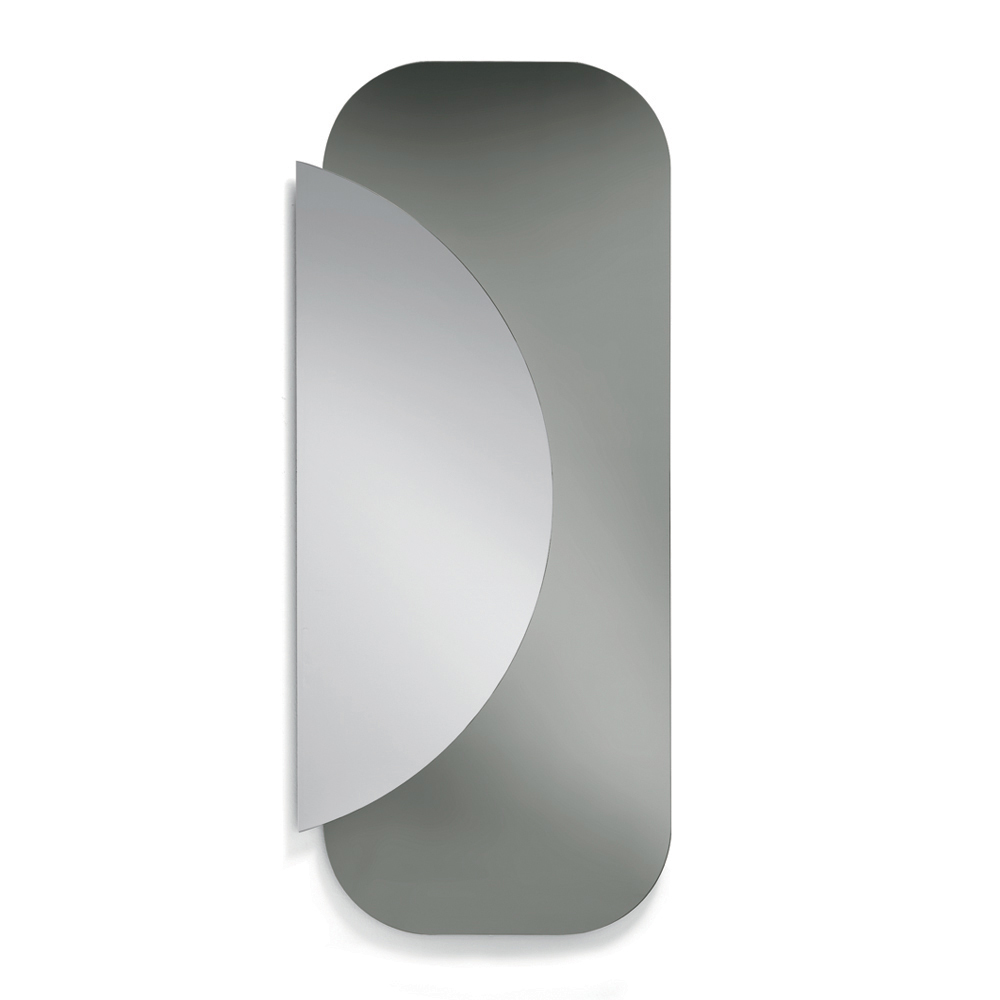 De compositie bestaat uit twee overlappende, gevormde platen : een rechthoekige basis met afgeronde hoeken en een halfronde plaat van natuurlijk spiegelglas die eroverheen valt, waardoor een elegante dialoog ontstaat tussen geometrie en reflecties. Dit contrast tussen vormen en materialen creëert een dynamisch en eigentijds visueel effect.