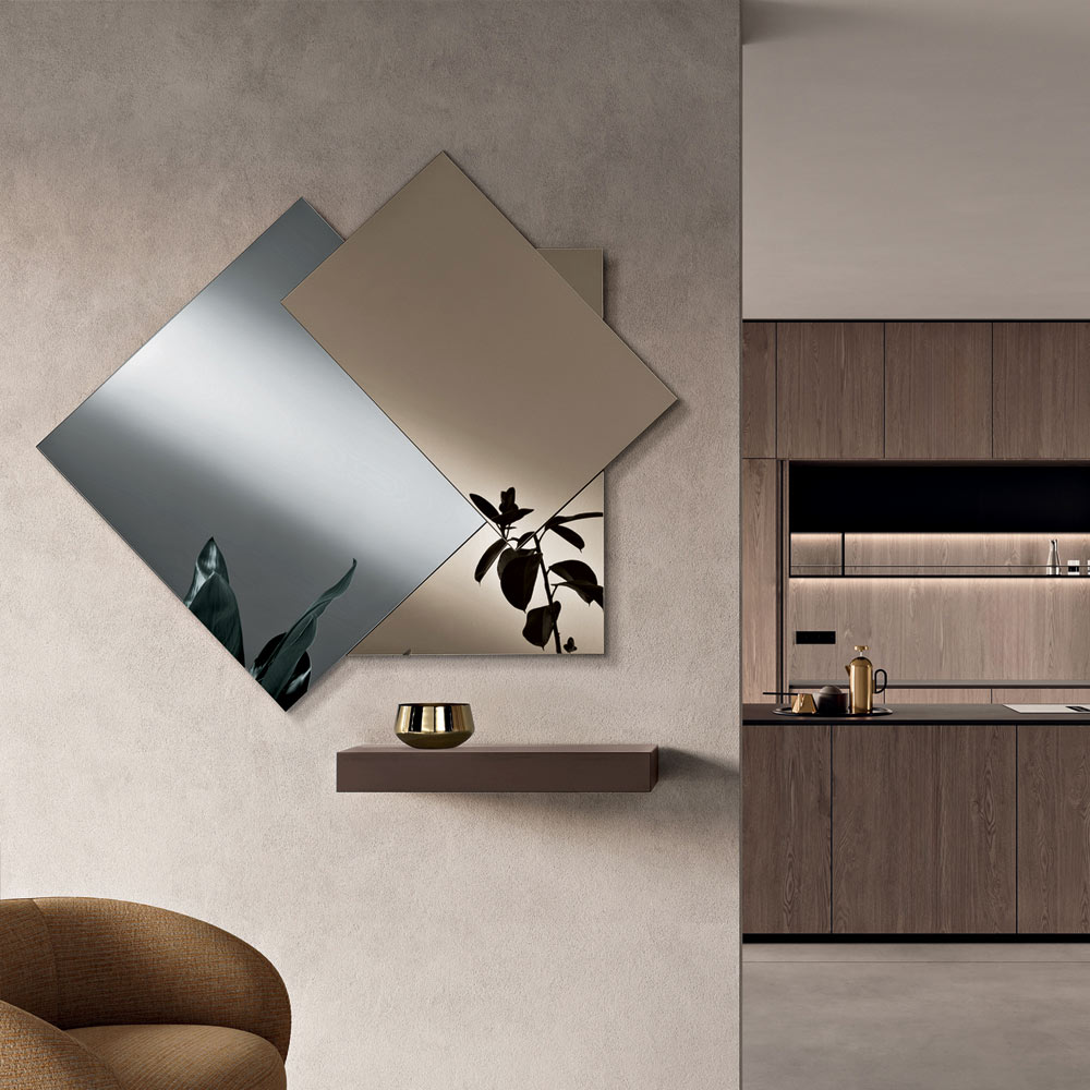 De spiegel is opgebouwd uit drie overlappende panelen die een verfijnd samenspel van lagen en reflecties creëren: twee elementen met een bronzen afwerking en één met een rookkleurige afwerking . Deze compositie vormt een oppervlak dat doorsneden wordt door lijnen en geometrische patronen, waardoor de ruimte visuele diepte en dynamiek krijgt.