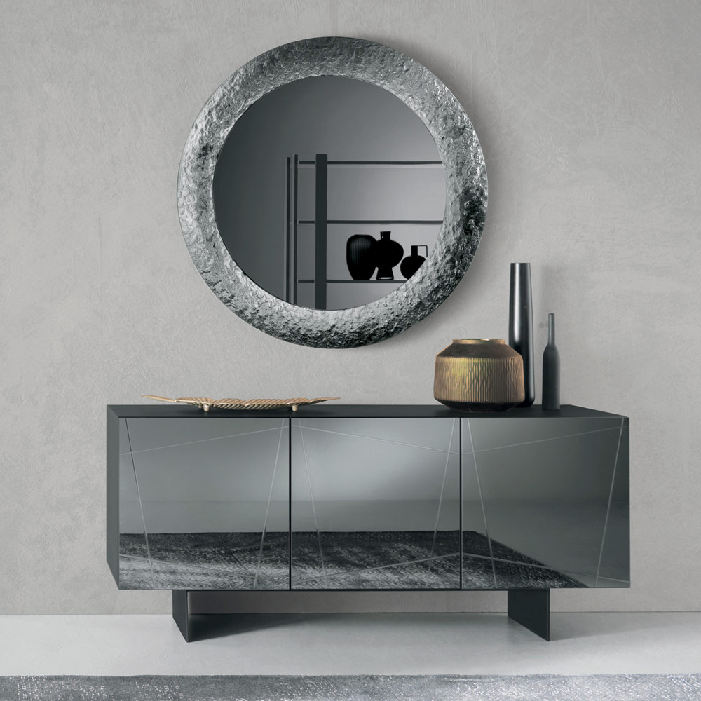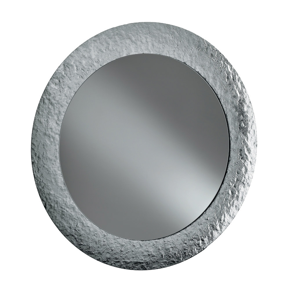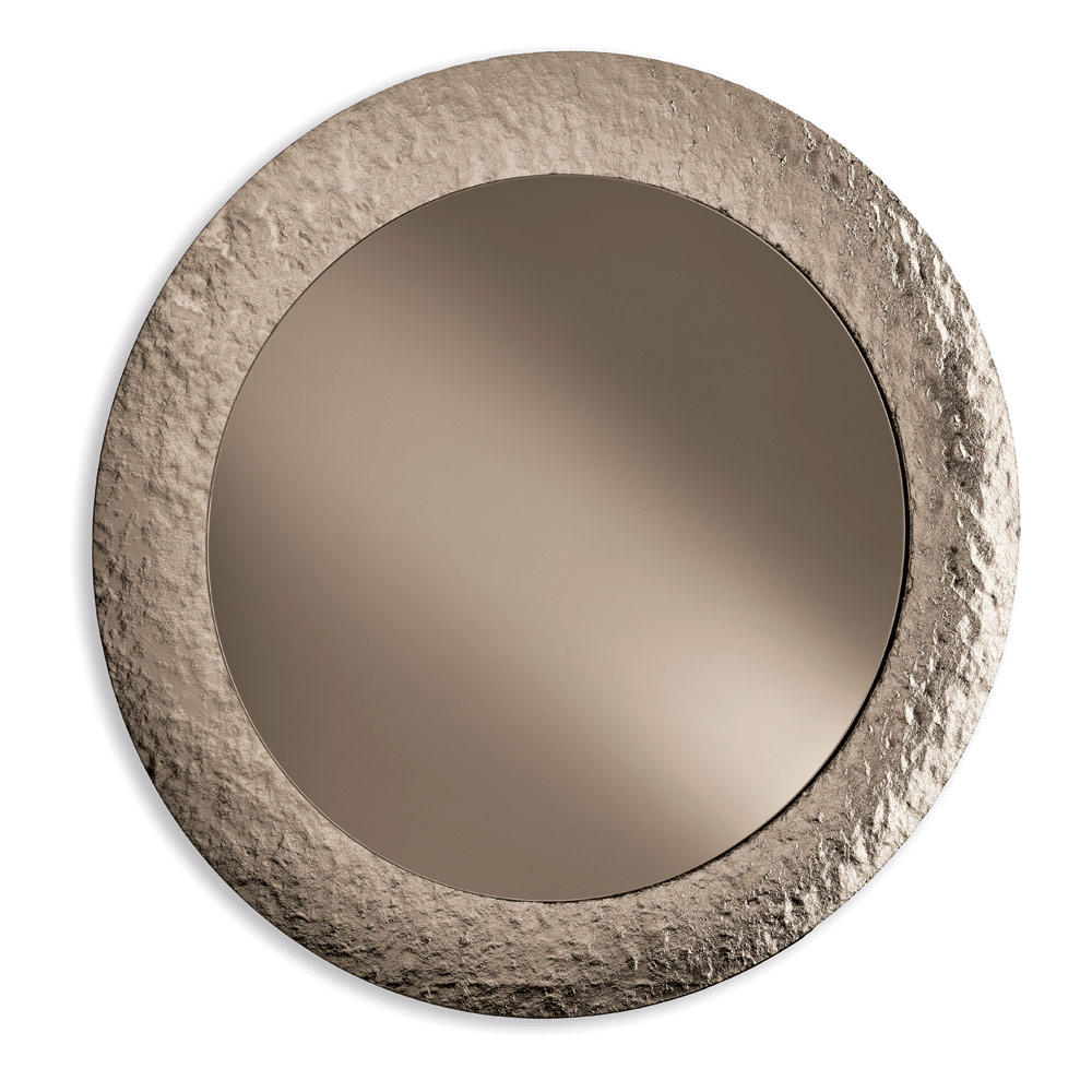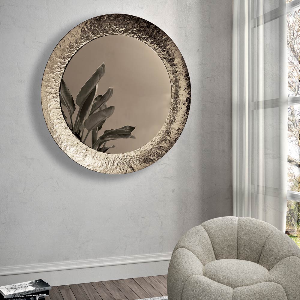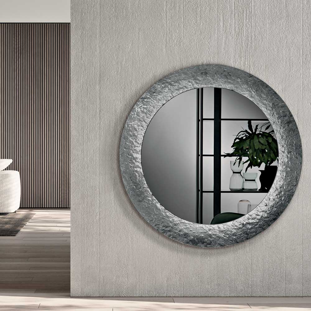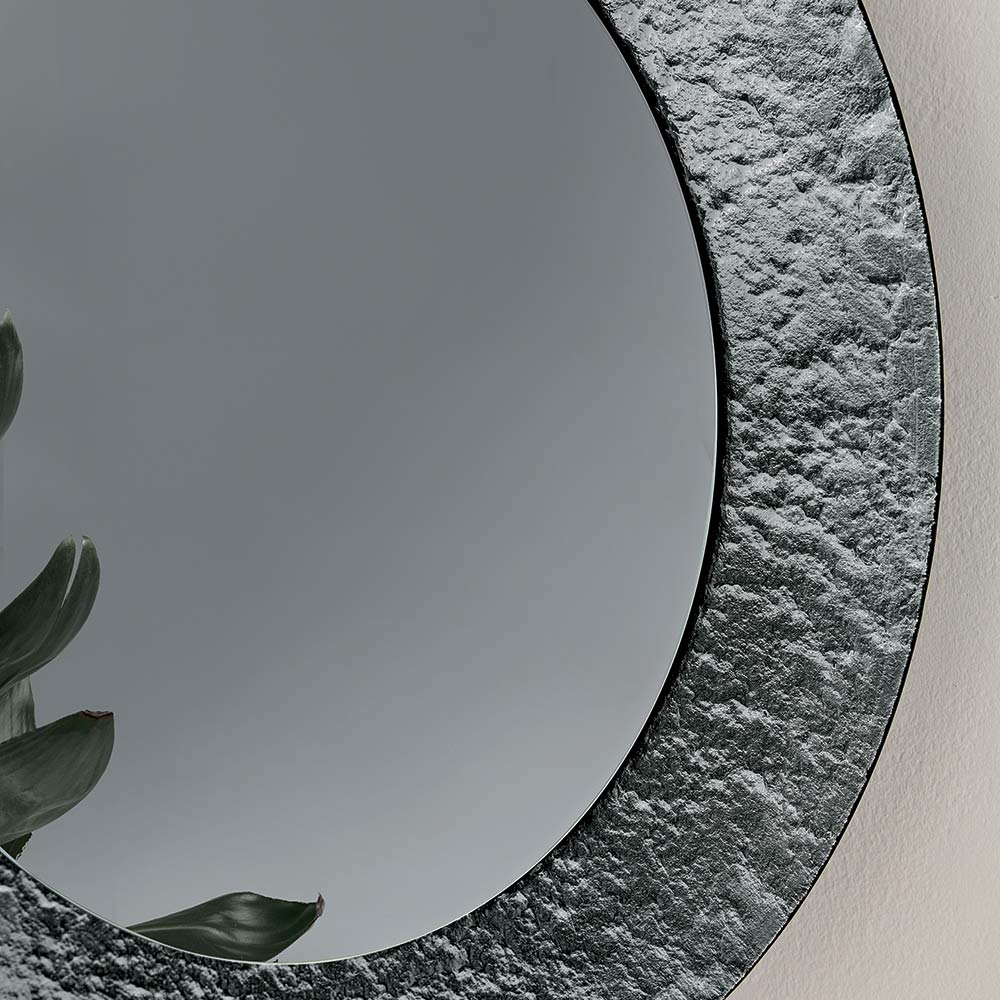 De spiegel heeft een ronde vorm en is afgewerkt met een frame van gehamerd glas met een zilverkleurige achterkant , wat het oppervlak een levendige, gestructureerde uitstraling geeft. De unieke afwerking reflecteert het licht op subtiele wijze, waardoor een elegant samenspel ontstaat dat de ruimte verfraait zonder opdringerig te zijn.