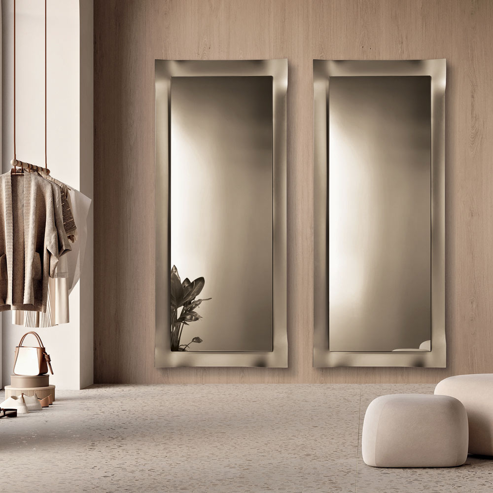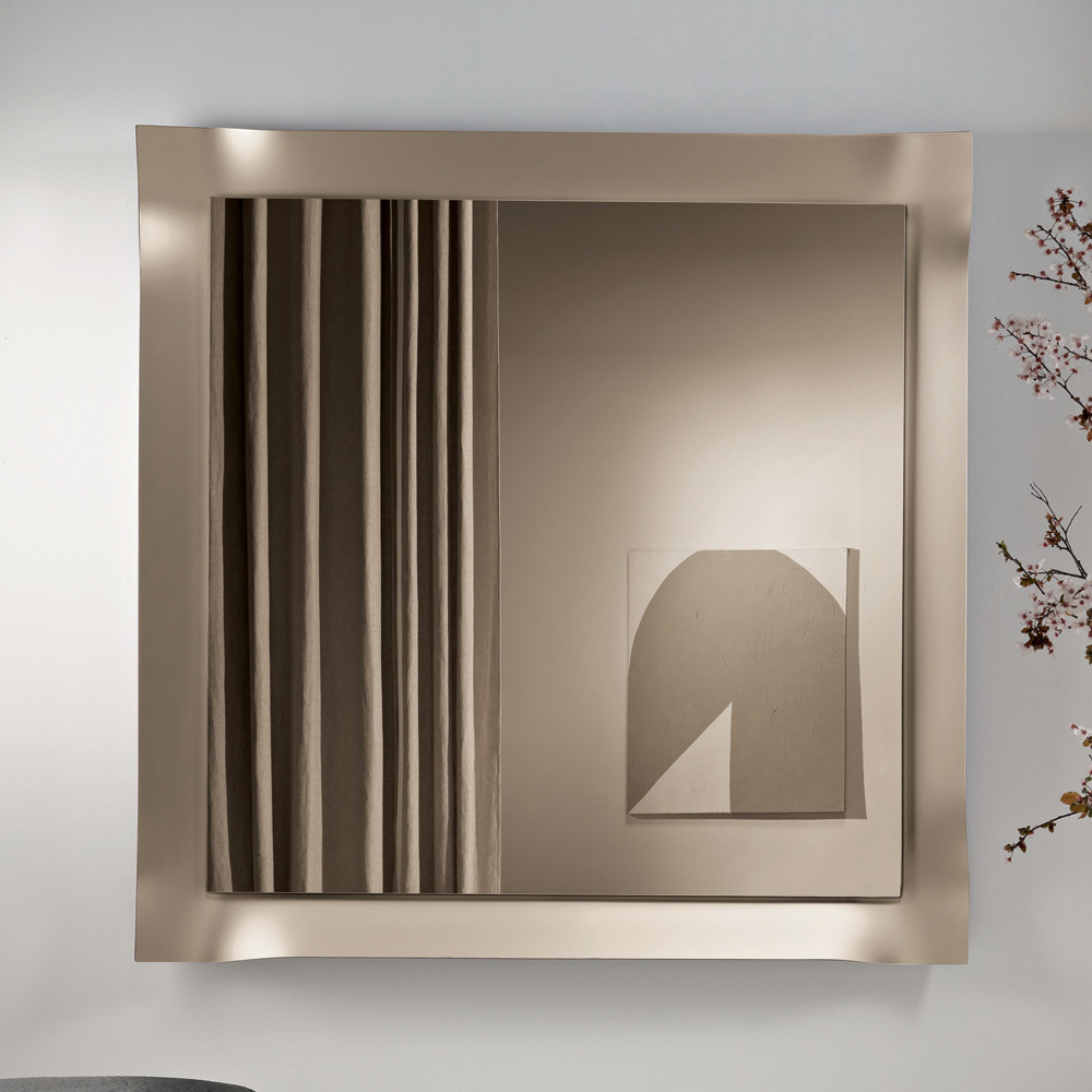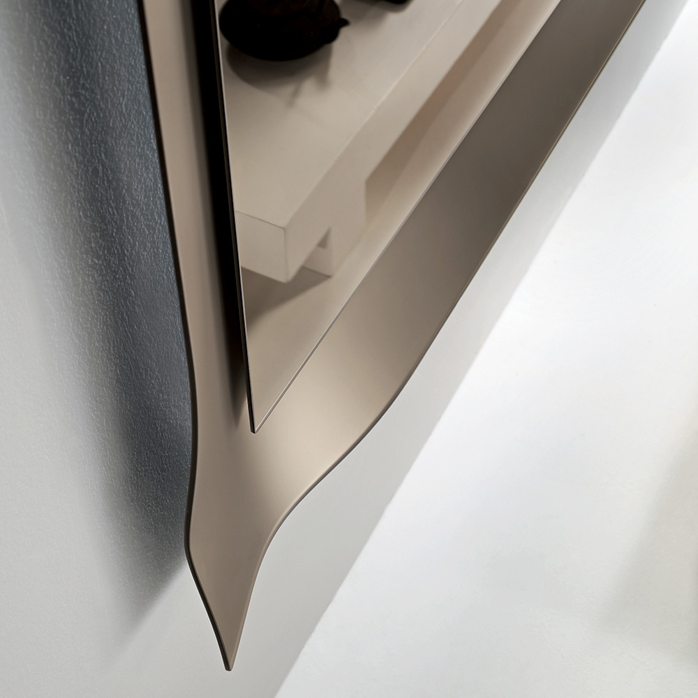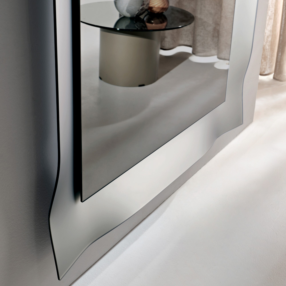 Het reflecterende oppervlak wordt omlijst door een frame van matglas met licht gebogen hoeken . Dit proces vangt en breekt het licht op subtiele wijze, waardoor een elegant spel van reflecties ontstaat dat het oppervlak verlevendigt en de spiegel diepte geeft.