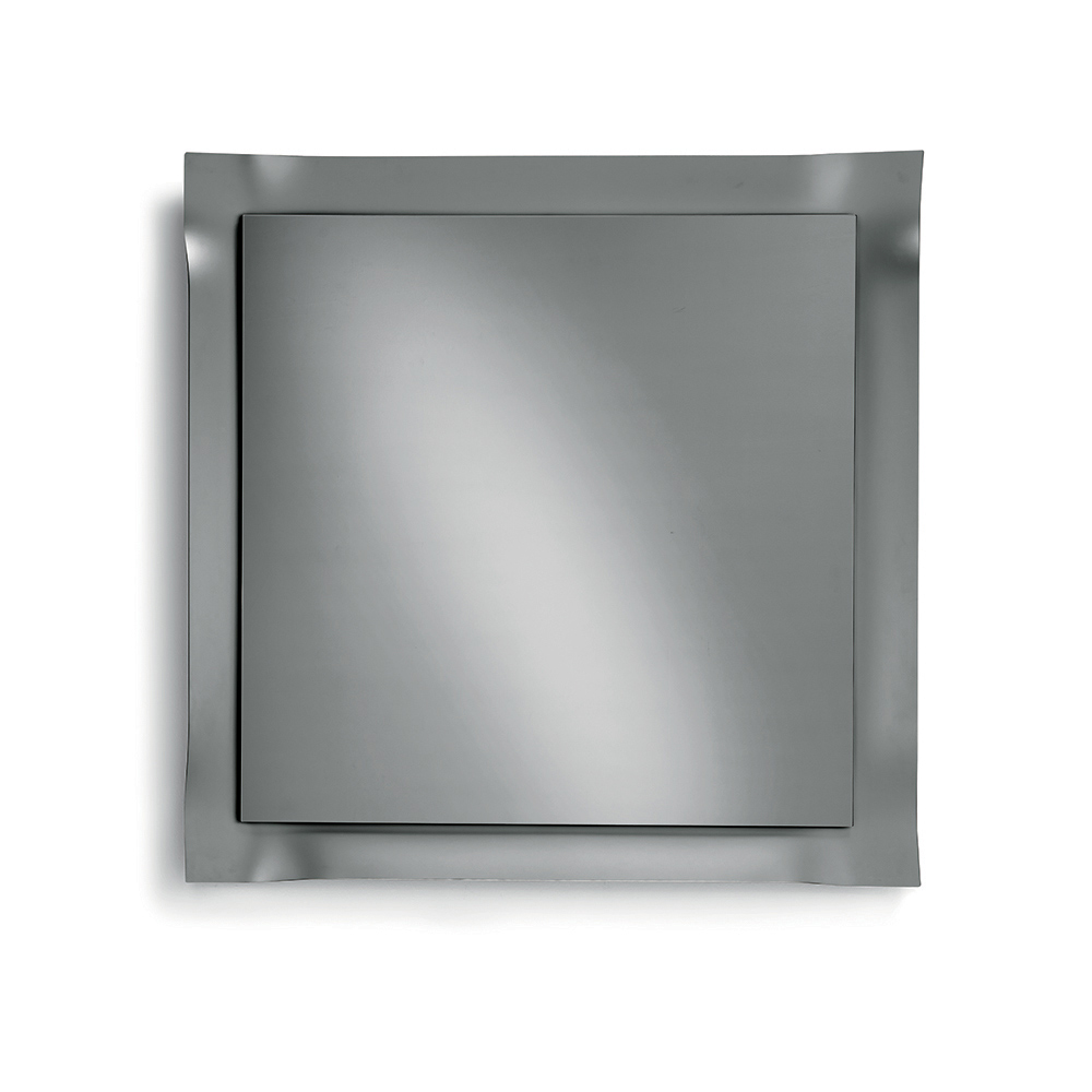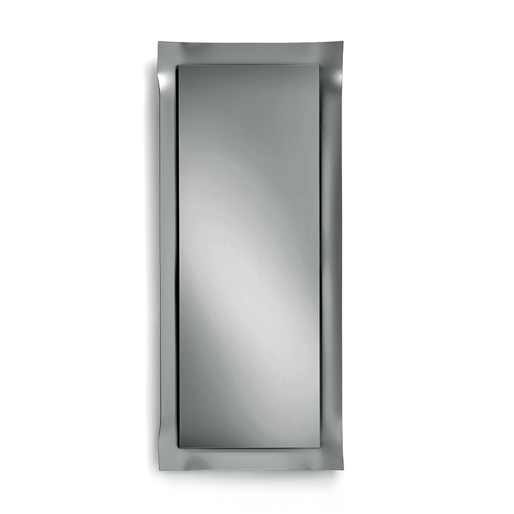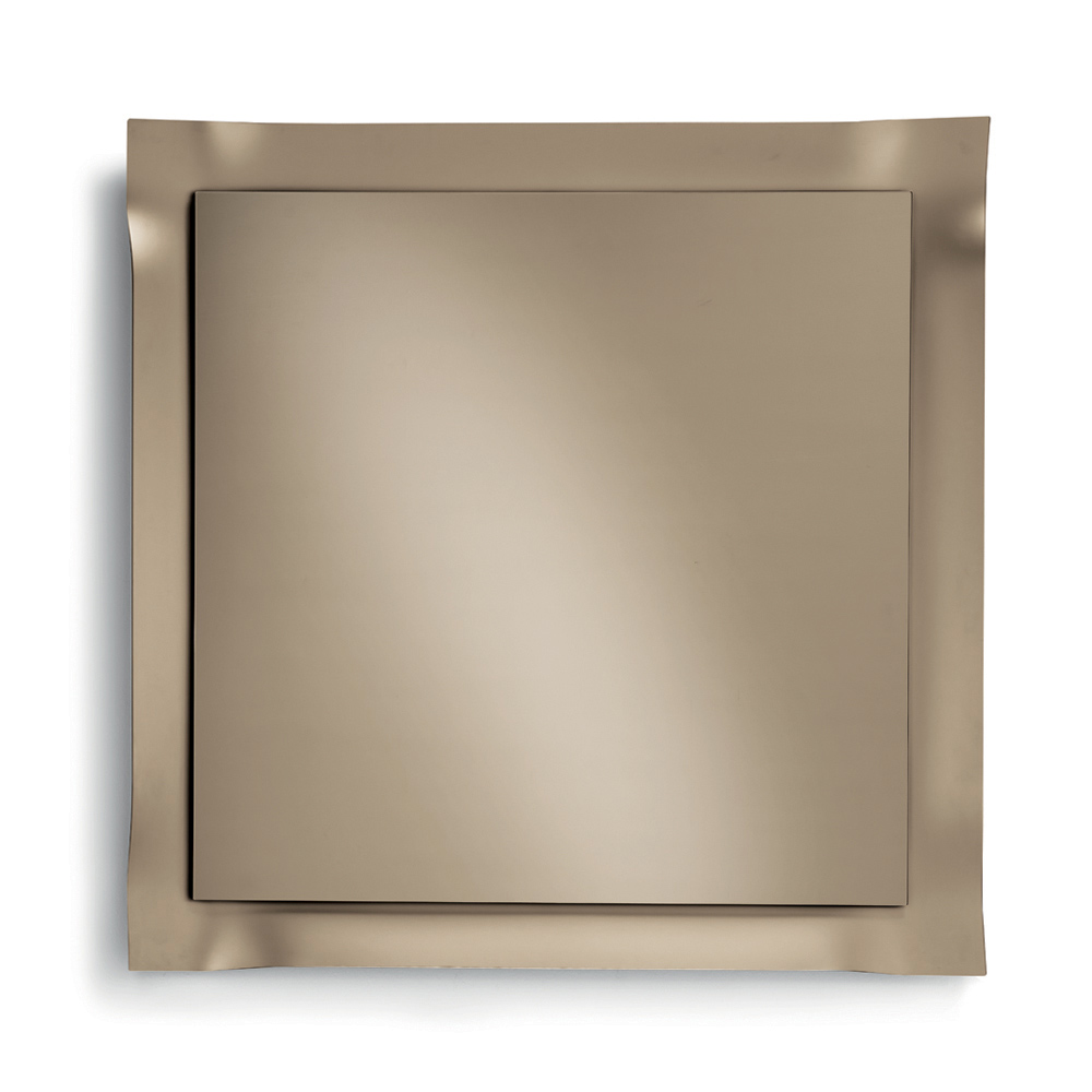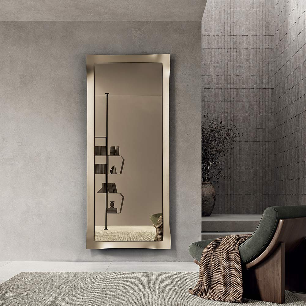 Het reflecterende oppervlak wordt omlijst door een frame van matglas met licht gebogen hoeken . Dit proces vangt en breekt het licht op subtiele wijze, waardoor een elegant spel van reflecties ontstaat dat het oppervlak verlevendigt en de spiegel diepte geeft.