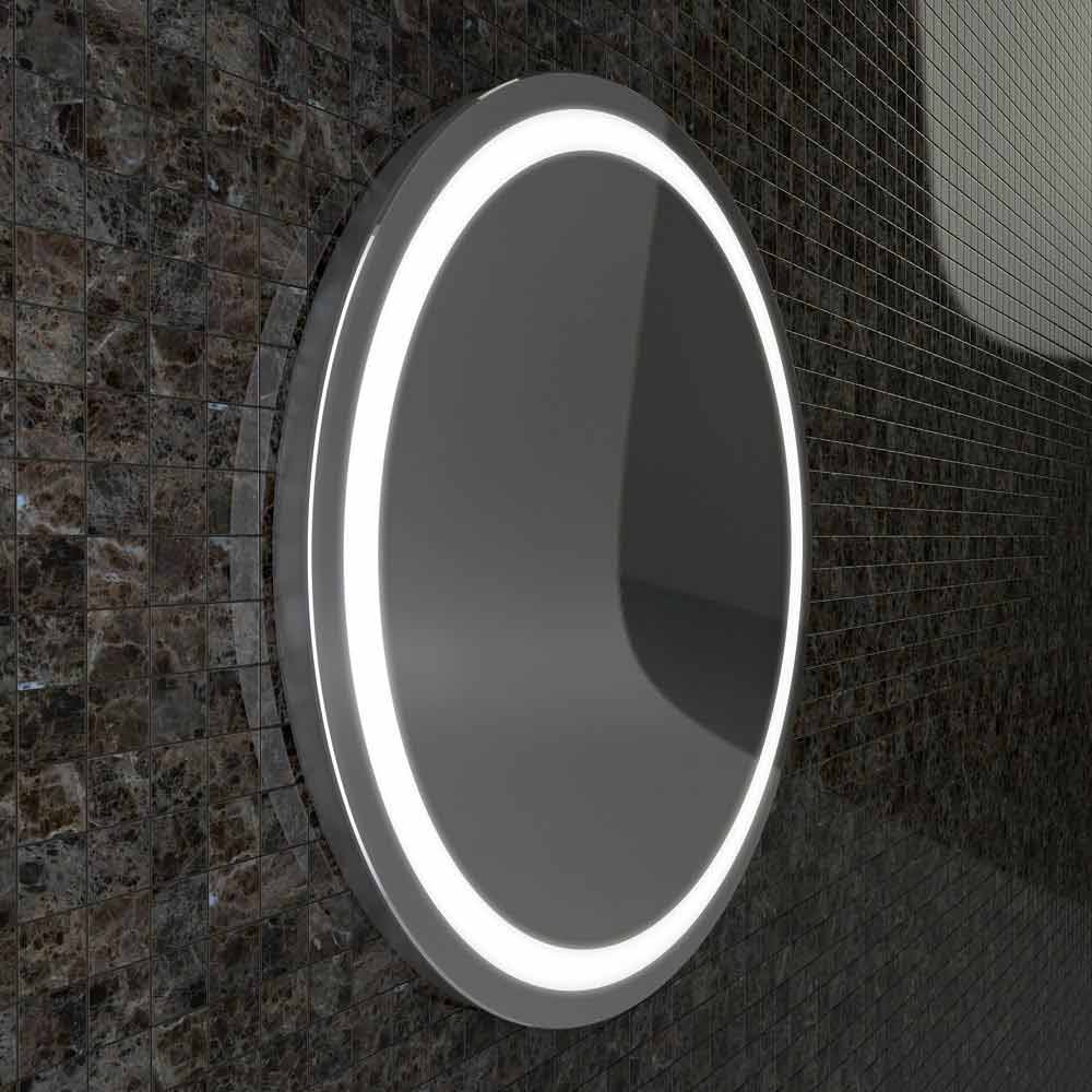 Ronde spiegel met geïntegreerde LED-verlichting in de spiegel met roestvrij stalen randen.