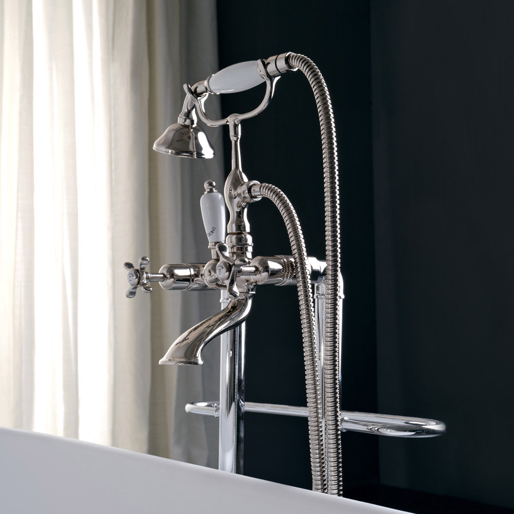 Vloeronderbouw badmethanddoekhouders, douchestoilet en slang gemaakt van zwaar messing, gegoten in mallen die de ambachtelijke systemen van het verleden respecteren en beschermd met een dikke afwerkingslaag nikkel.