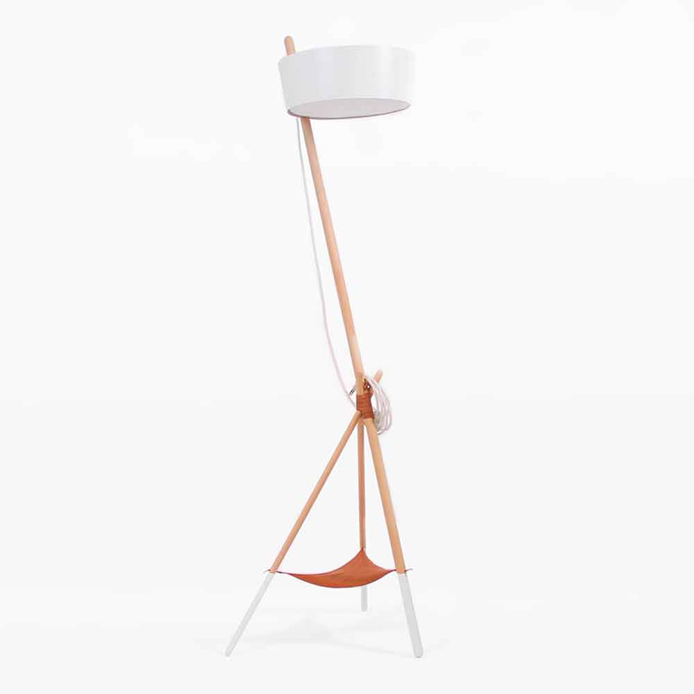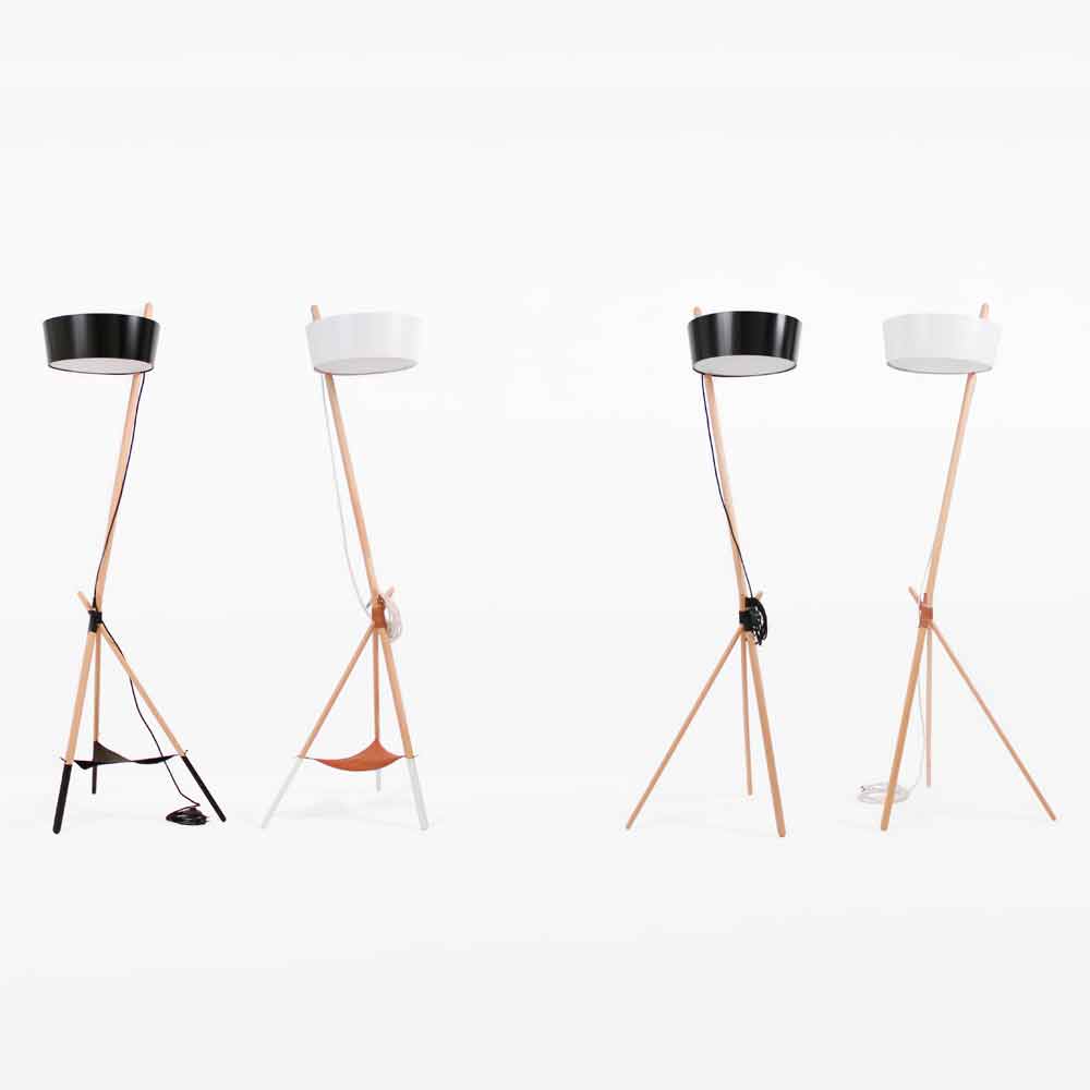 Design vloerlamp in massief beukenhout en gelakt staal.