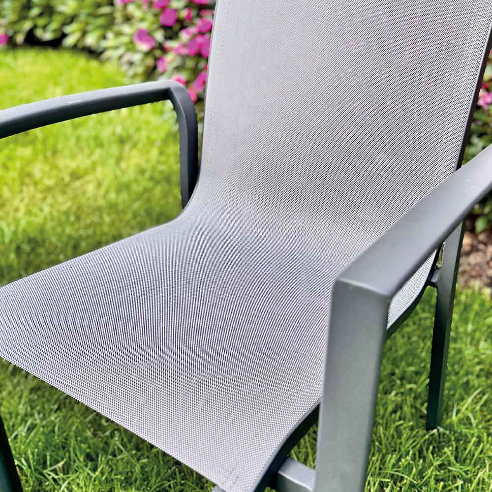 Het gelakte aluminium frame is stevig maar licht, bestand tegen roest en weersinvloeden, perfect om zorgeloos buiten te leven. De zitting en rugleuning van Textilene , een ademende en flexibele technische stof, garanderen ergonomisch comfort, zelfs na urenlang gebruik, en passen zich soepel aan het lichaam aan.