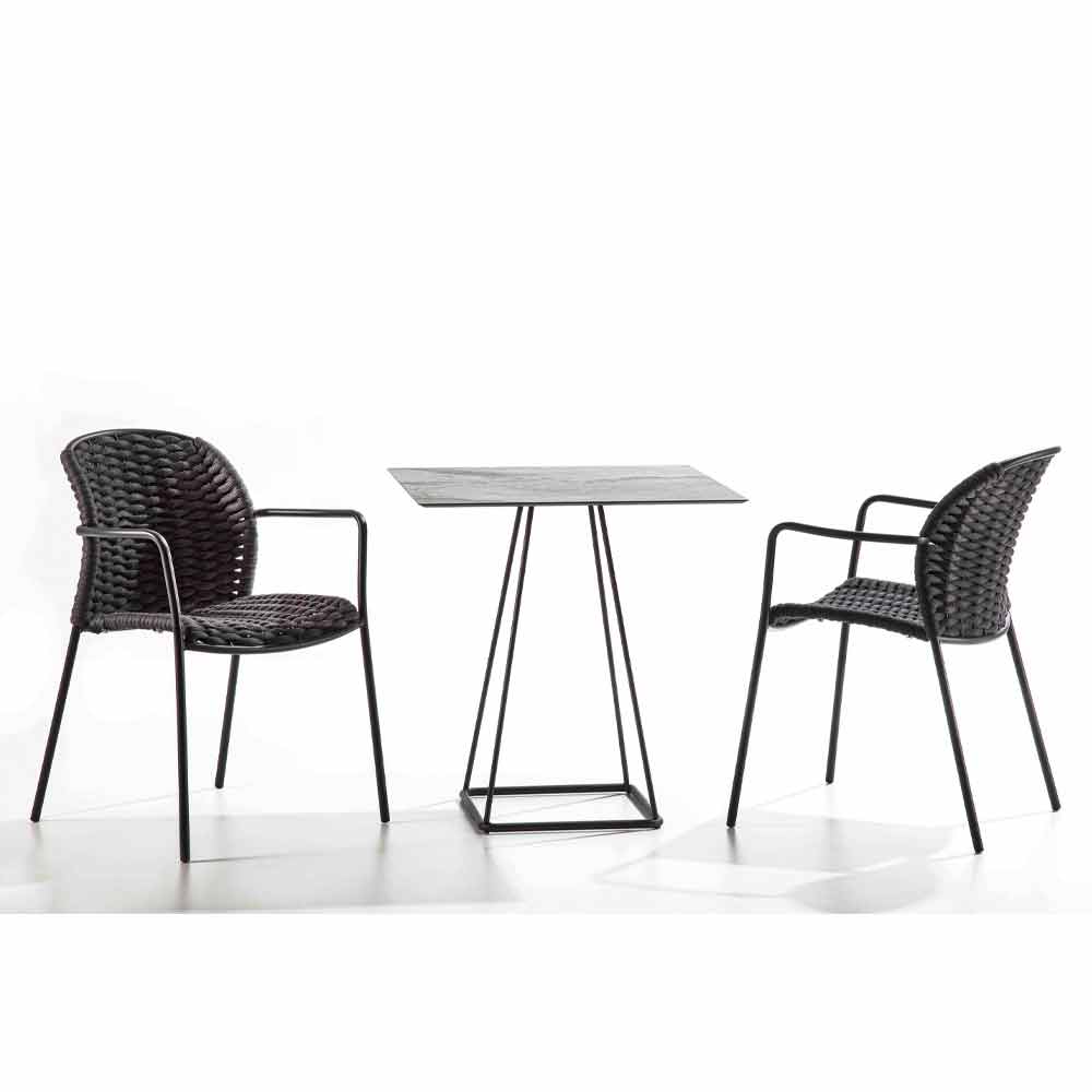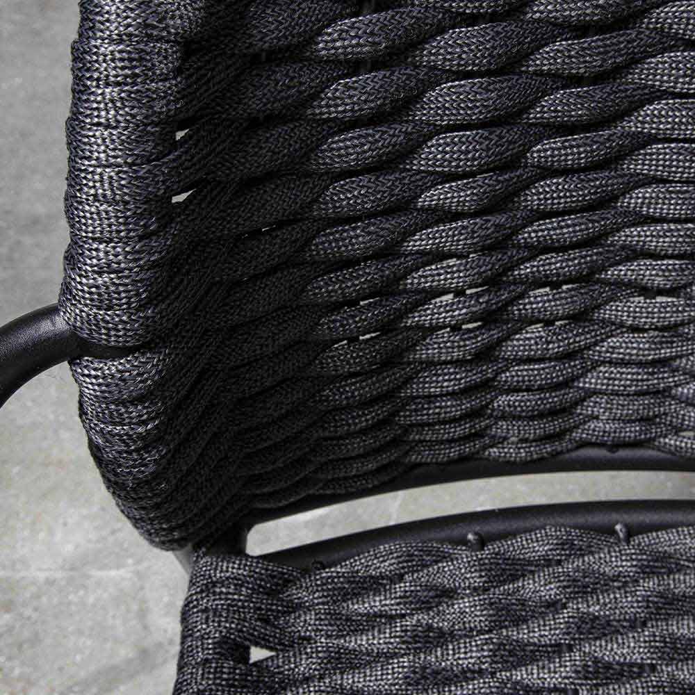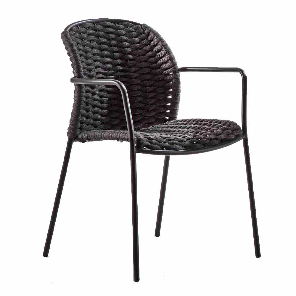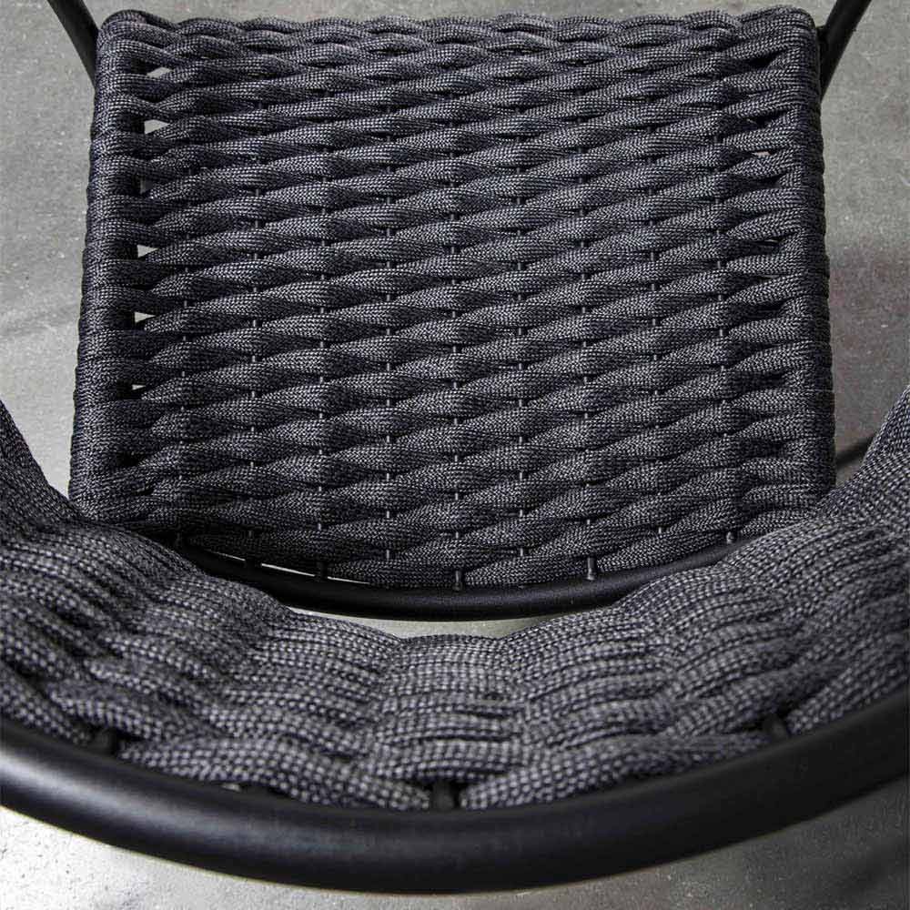 Buitenstoel met stapelbare structuur in gegalvaniseerd metaal antraciet afwerking voorzien van armleuningen en zitting en rugleuning in geweven polyester touw (binnenkant in rubber) antraciet afwerking. Een inrichtingsoplossing die optimaal comfort combineert met een aangename esthetische kant die perfect past bij de meest uiteenlopende inrichtingsstijlen. Zijn esthetiek maakt het zelfs mogelijk om buitenruimtes te voltooien door een perfecte harmonie te creëren met de andere aanwezige elementen of door te spelen op prachtige stijlcontrasten voor een exclusief en avant-gardistisch resultaat .