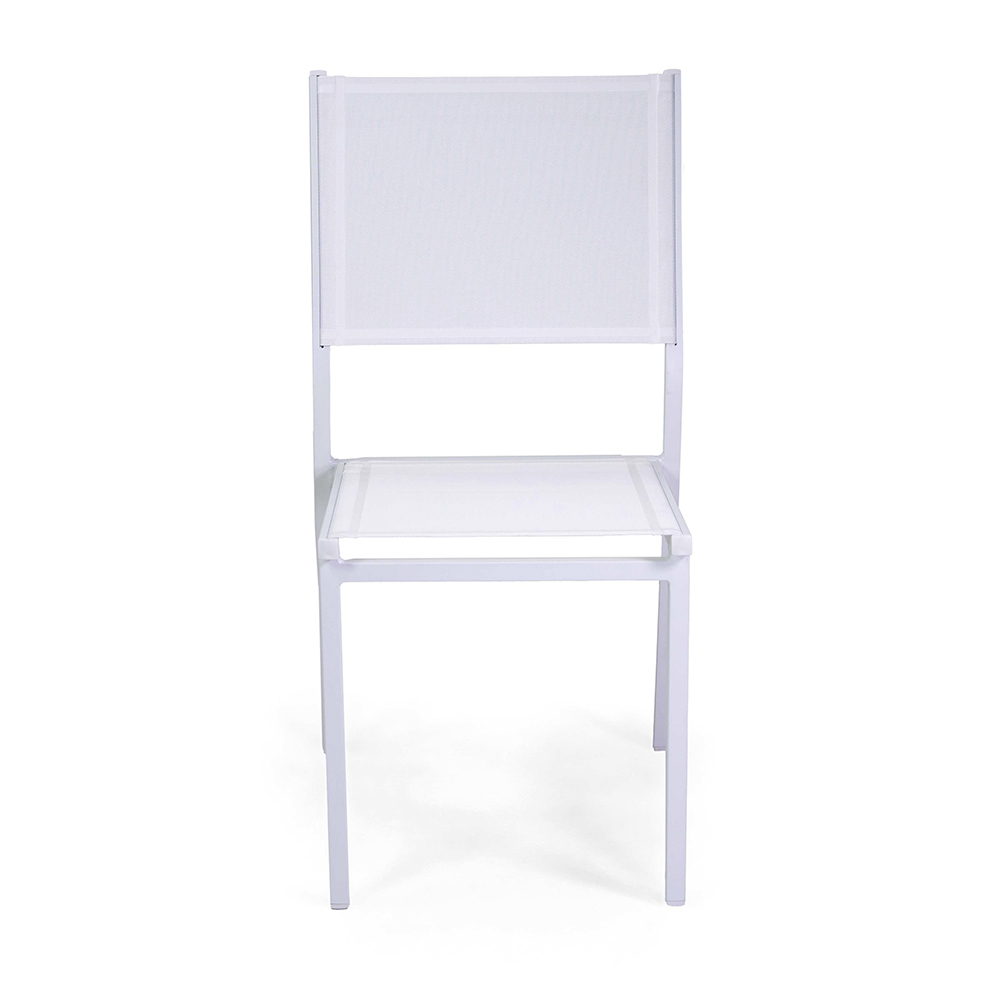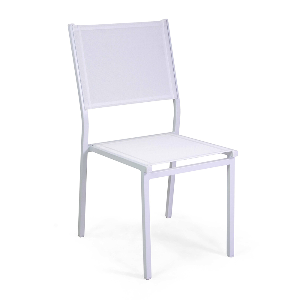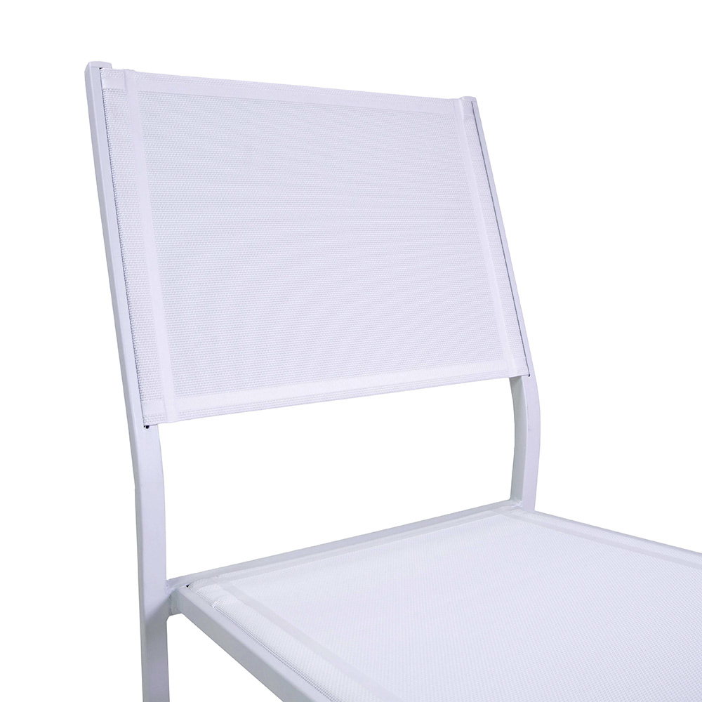 Deze stoel met een wit gepoedercoat aluminium frame vertegenwoordigt de ideale balans tussen functionaliteit en stijl, perfect voor buitenomgevingen zoals tuinen en terrassen. Het witte textilene geeft de stoel niet alleen een moderne en elegante uitstraling, maar zorgt ook voor een comfortabele en weerbestendige zitting.