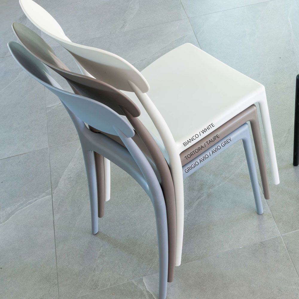 polypropyleen. Dit product is ontworpen voor iedereen die functionaliteit met eenvoud wil combineren. In feite is deze stoel perfect voor plaatsing in woonruimtes, keukens en eetkamers, zowel intern als extern, waar dagelijkse familiemomenten worden ervaren en waar functionaliteit essentieel is. Dankzij de gebruikte materialen voor de productie willen we de klant een product garanderen dat niet alleen mooi is om naar te kijken, maar ook van kwaliteit en duurzaam is
