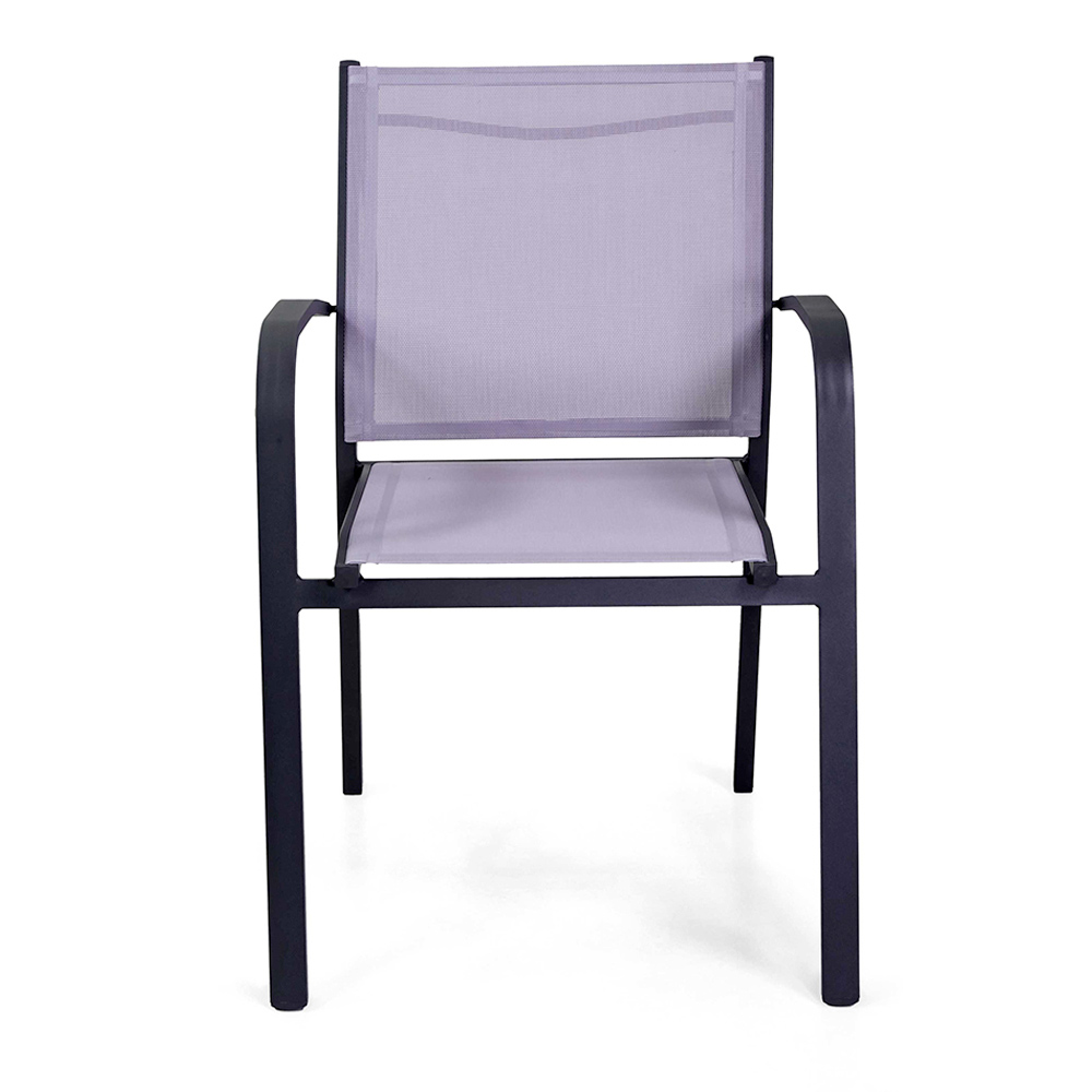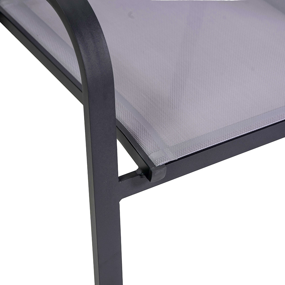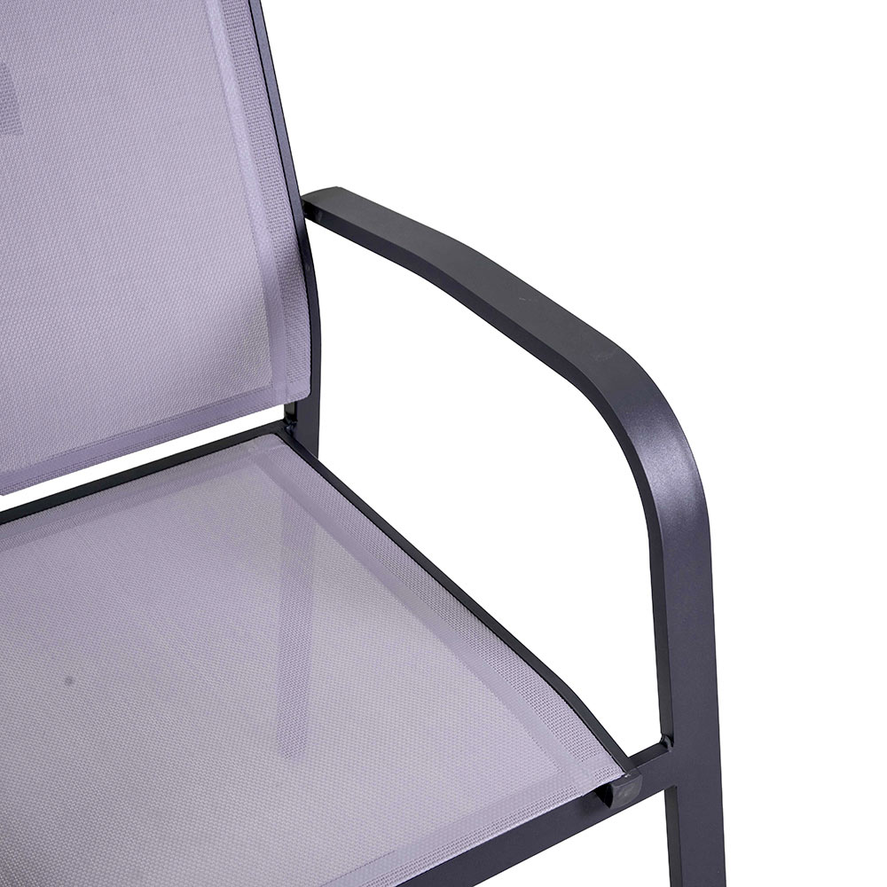 Deze stoel met antraciet gepoedercoat aluminium frame vertegenwoordigt de ideale balans tussen functionaliteit en stijl, perfect voor buitenomgevingen zoals tuinen en terrassen. Het grijze textilene geeft de stoel niet alleen een moderne en elegante uitstraling, maar zorgt ook voor een comfortabele en weerbestendige zitting.