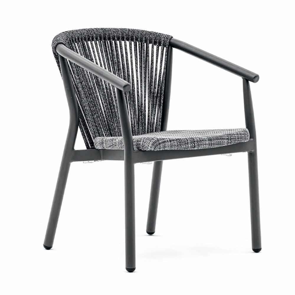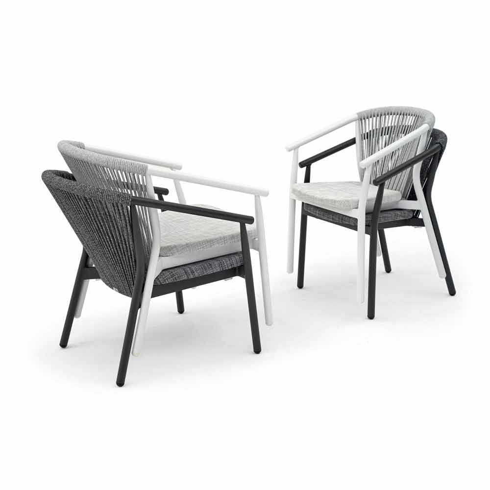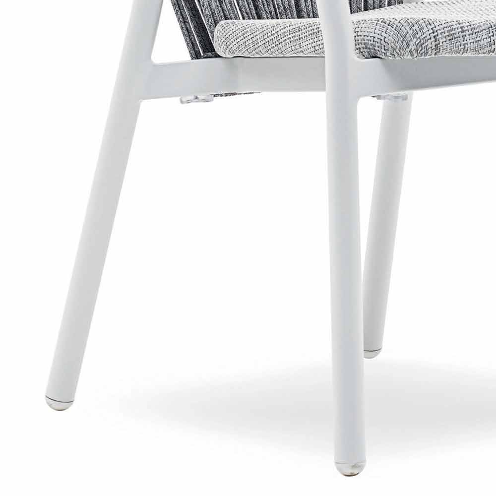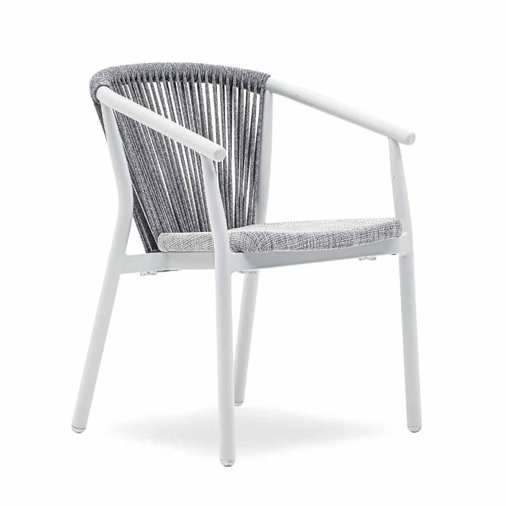 Moderne design stapelbare tuinstoel met aluminium onderstel en zitting in wit of askleurige technische stof.