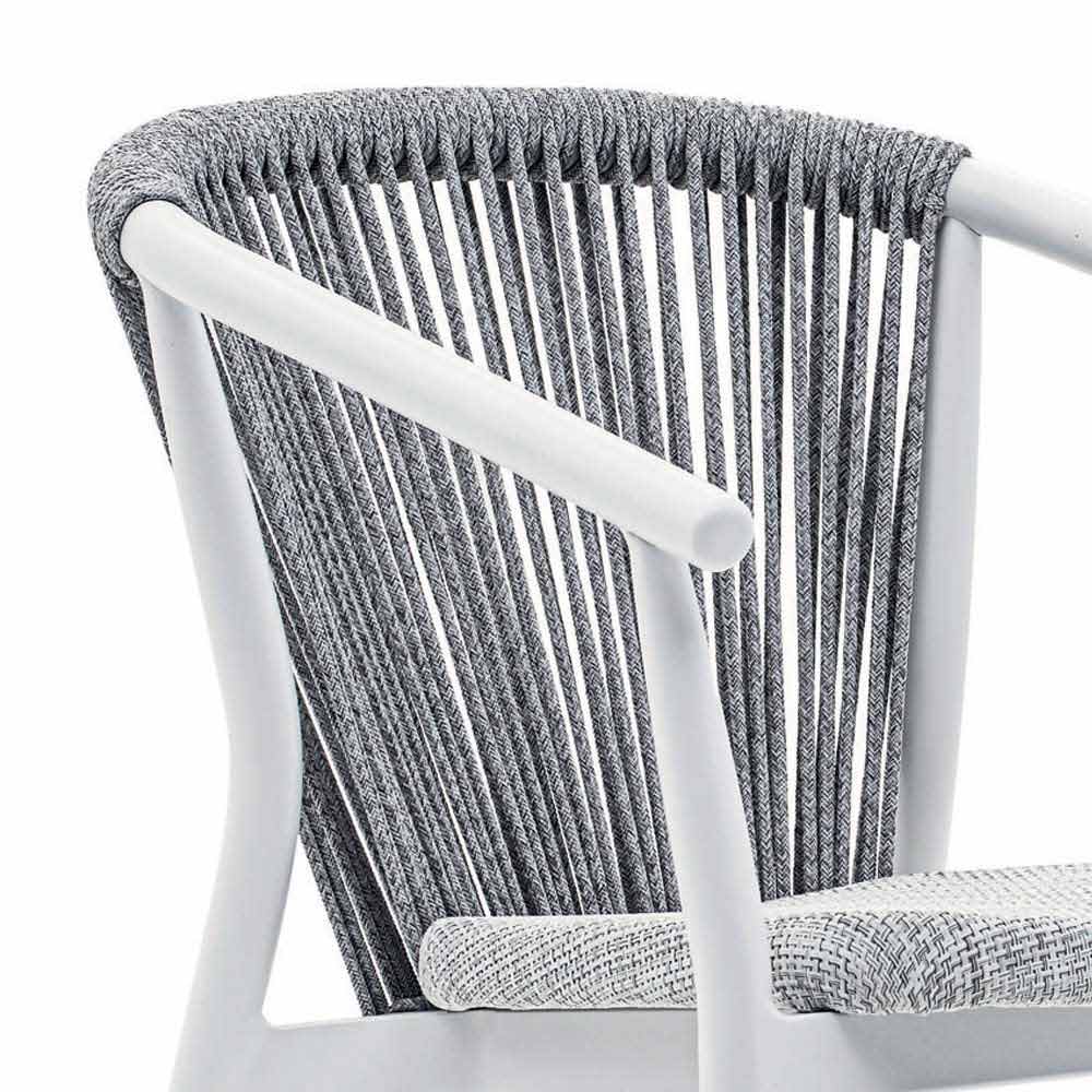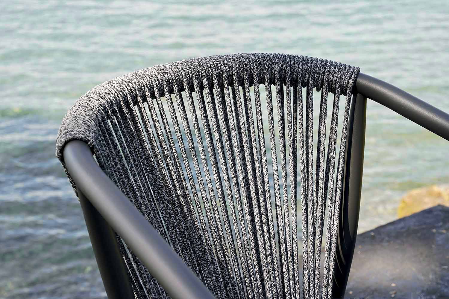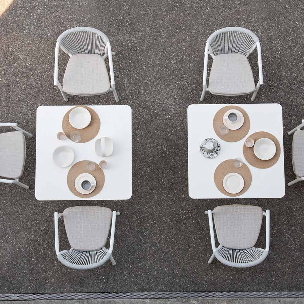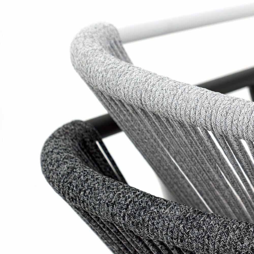Moderne design stapelbare tuinstoel met aluminium onderstel en zitting in wit of askleurige technische stof.