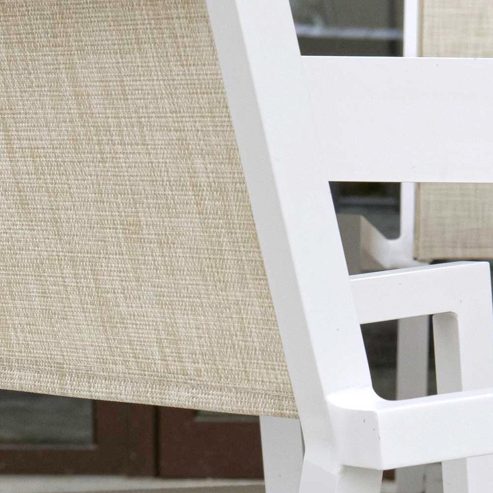 De stabiele structuur in mat wit aluminium garandeert duurzaamheid en weerstand tegen de elementen en behoudt zijn schoonheid na verloop van tijd. De beige textilene bekleding voegt niet alleen een vleugje klasse toe met zijn verfijnde textuur, maar biedt ook ongeëvenaard comfort dankzij zijn elasticiteit en ademend vermogen.