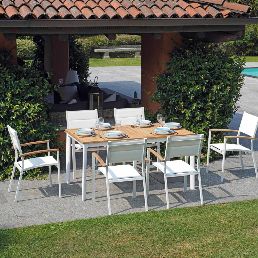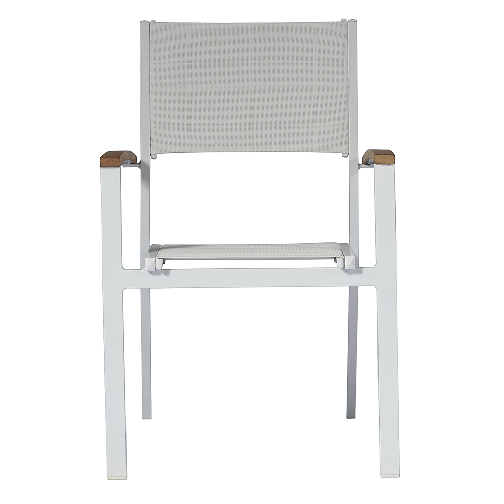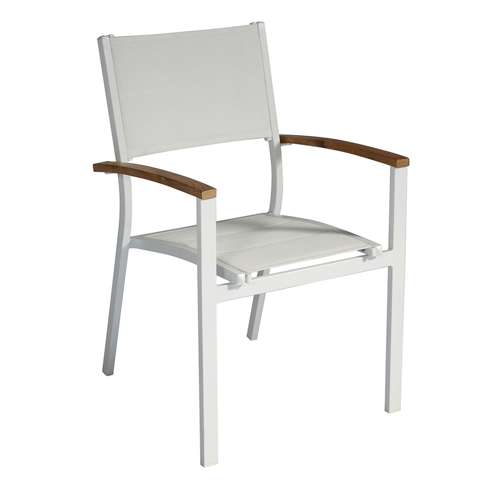 Stapelbare buitenstoel met structuur van aluminium en zitting in ivoorkleurig gewatteerd textileen verrijkt met elegante teak armleuningen . Deze buitenstoel combineert design en eenvoud , het resultaat van eenvoudige maar resistente materialen die leven geven aan een product met een origineel en avant-gardistisch ontwerp, perfect om elke omgeving te voltooien.