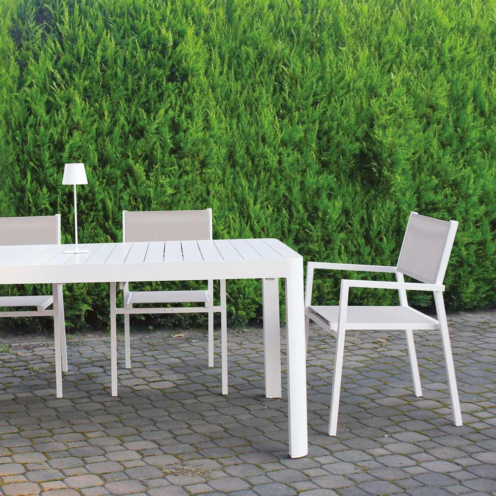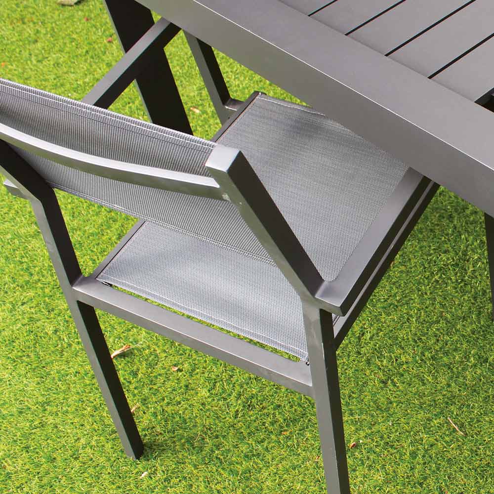 De zitting en rugleuning van textileen , een ademend en comfortabel technisch materiaal, garanderen een ergonomische en aangename zitervaring, zelfs op de warmste dagen. De kleur geeft de stoel een ingetogen elegantie , perfect voor bij de eettafel of salontafel in de tuin, op het terras of in kantoorruimtes.