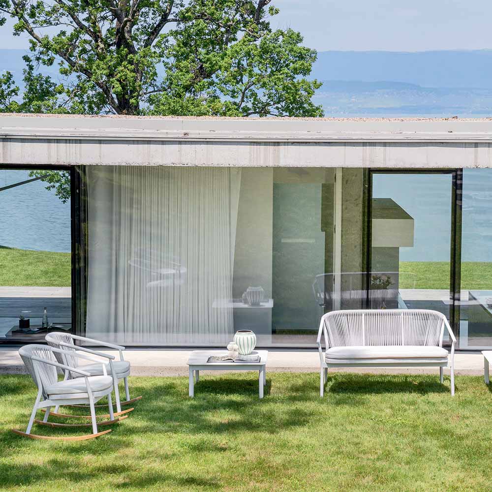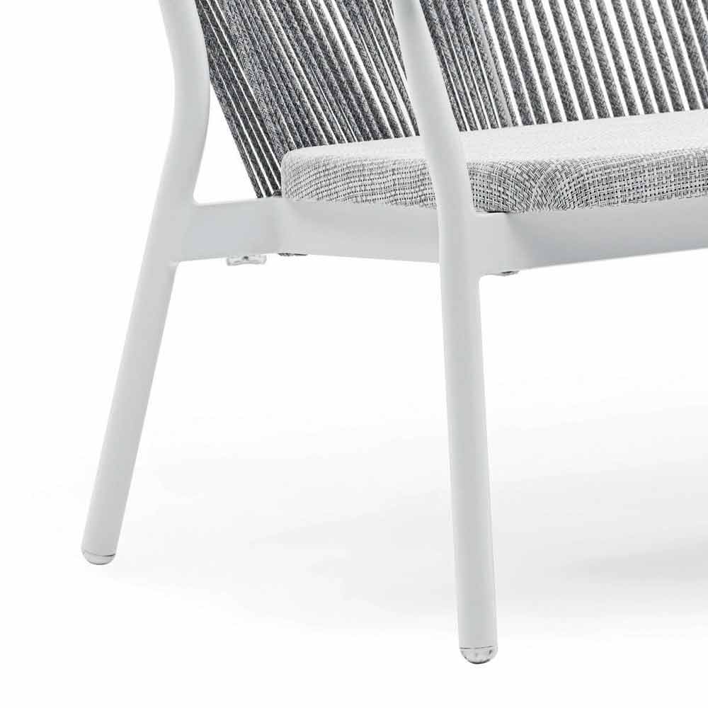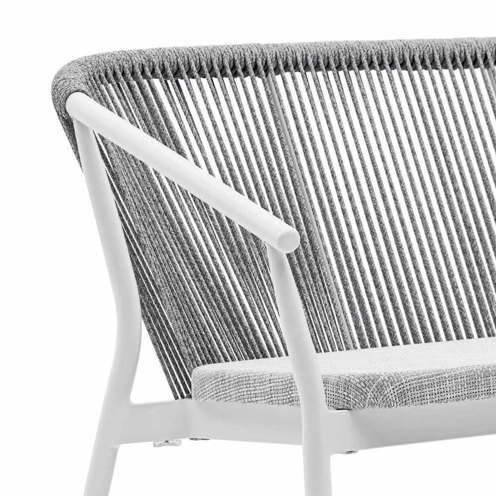 De verstrengeling van de rugleuning in VAR # TEX synthetisch koord verbetert de esthetiek van deze bank die is ontworpen om te genieten van buitendagen in gezelschap.