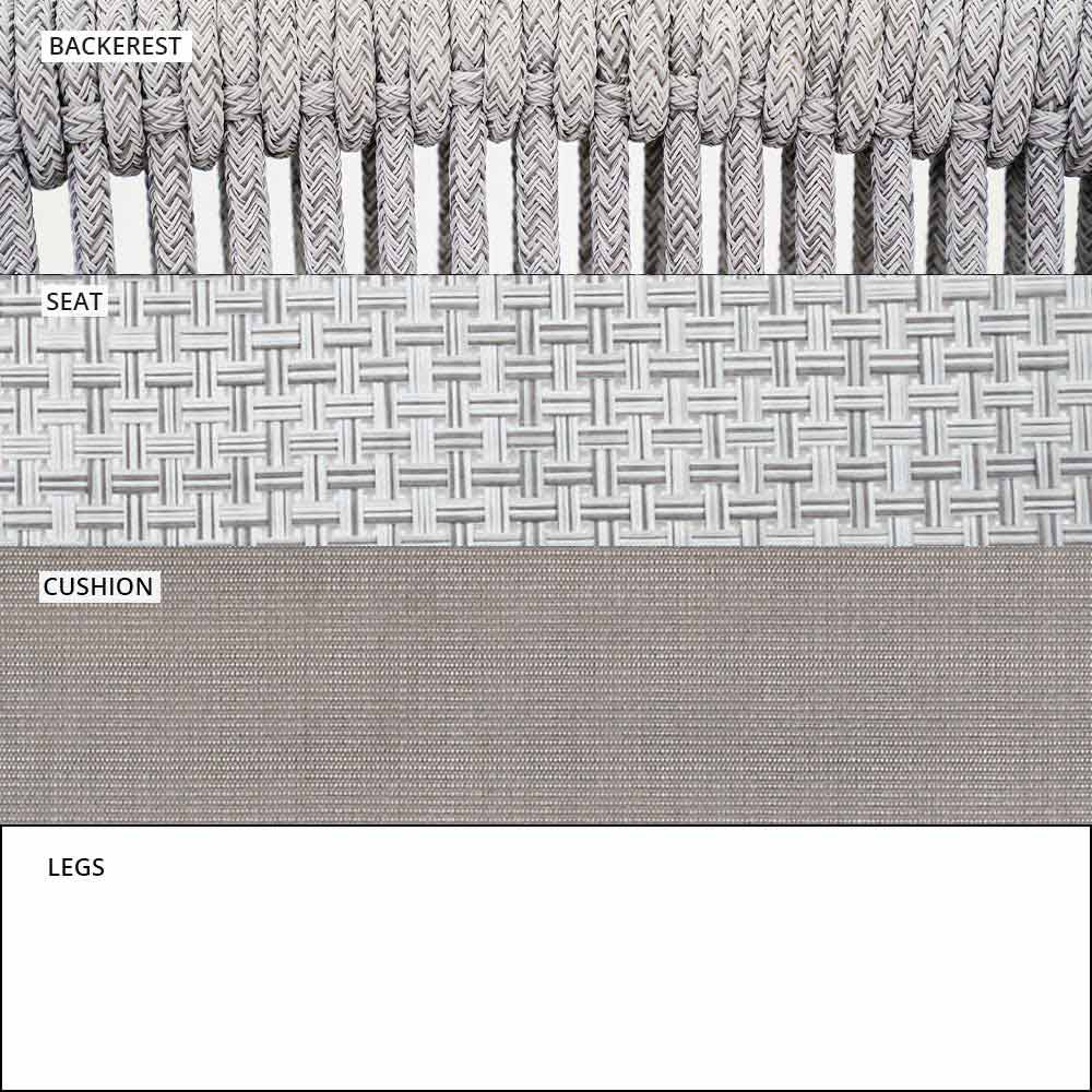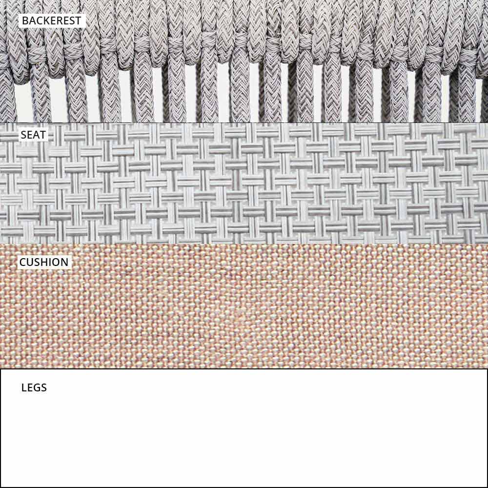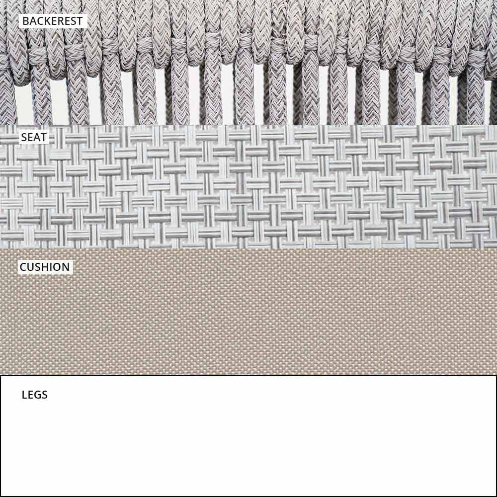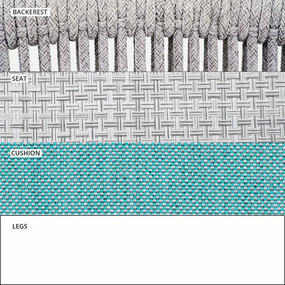 De verstrengeling van de rugleuning in VAR # TEX synthetisch koord verbetert de esthetiek van deze bank die is ontworpen om te genieten van buitendagen in gezelschap.
