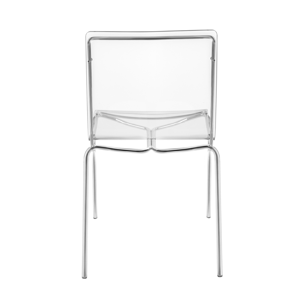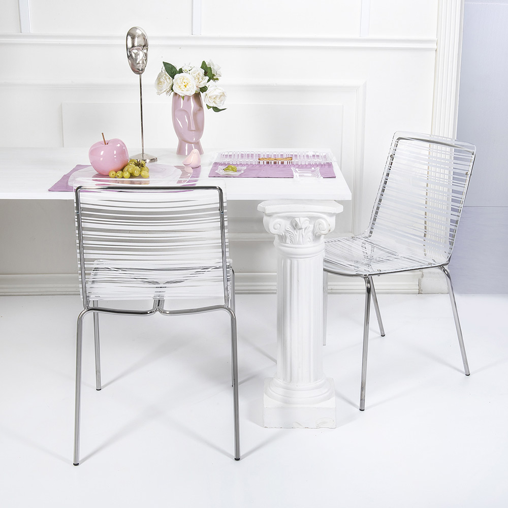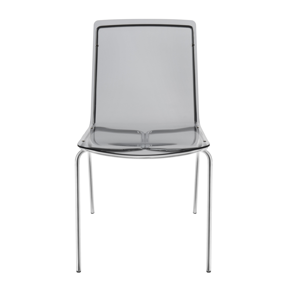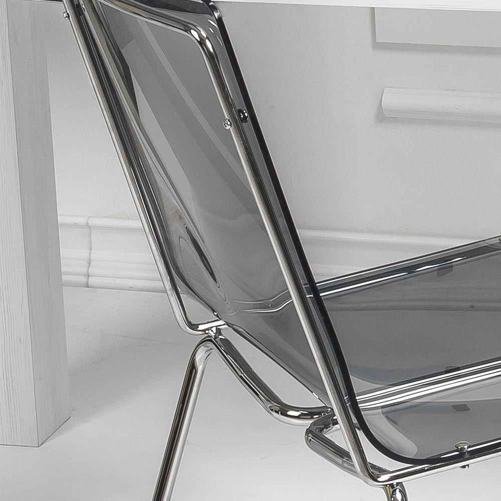 Eetkamerstoel geheel made in Italy met plexiglas kuip en verchroomde ijzeren poten waardoor hij ook makkelijk stapelbaar is. Gekenmerkt door een eenvoudig en strak design , is dit meubelstuk veelzijdig en eigentijds , mede dankzij de gebruikte innovatieve materialen die zijn geometrische elegantie benadrukken .