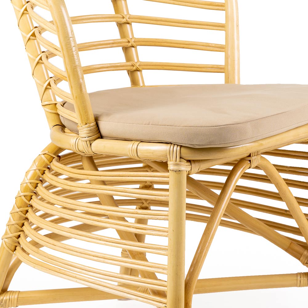 Buitenstoel gemaakt van geweven natuurlijke rotan en voorzien van een zitkussen met bekleding in de standaard "Stone Beige" finish .