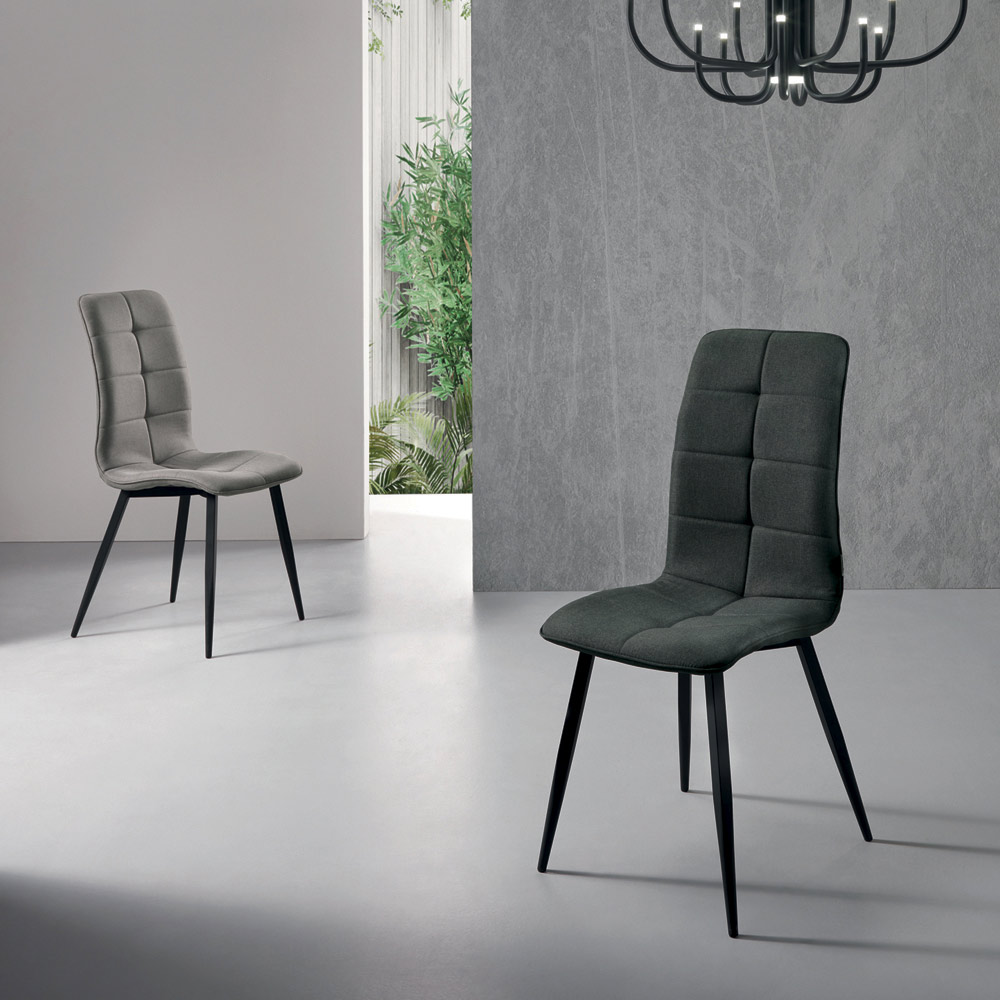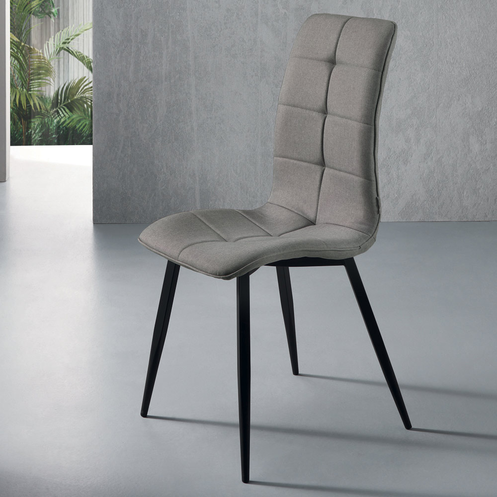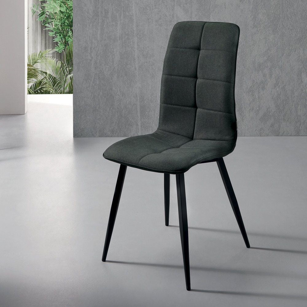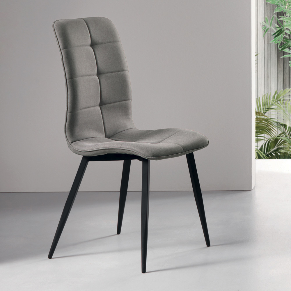 Moderne 4-delige eetkamerstoel met zwart metalen onderstel en stof.