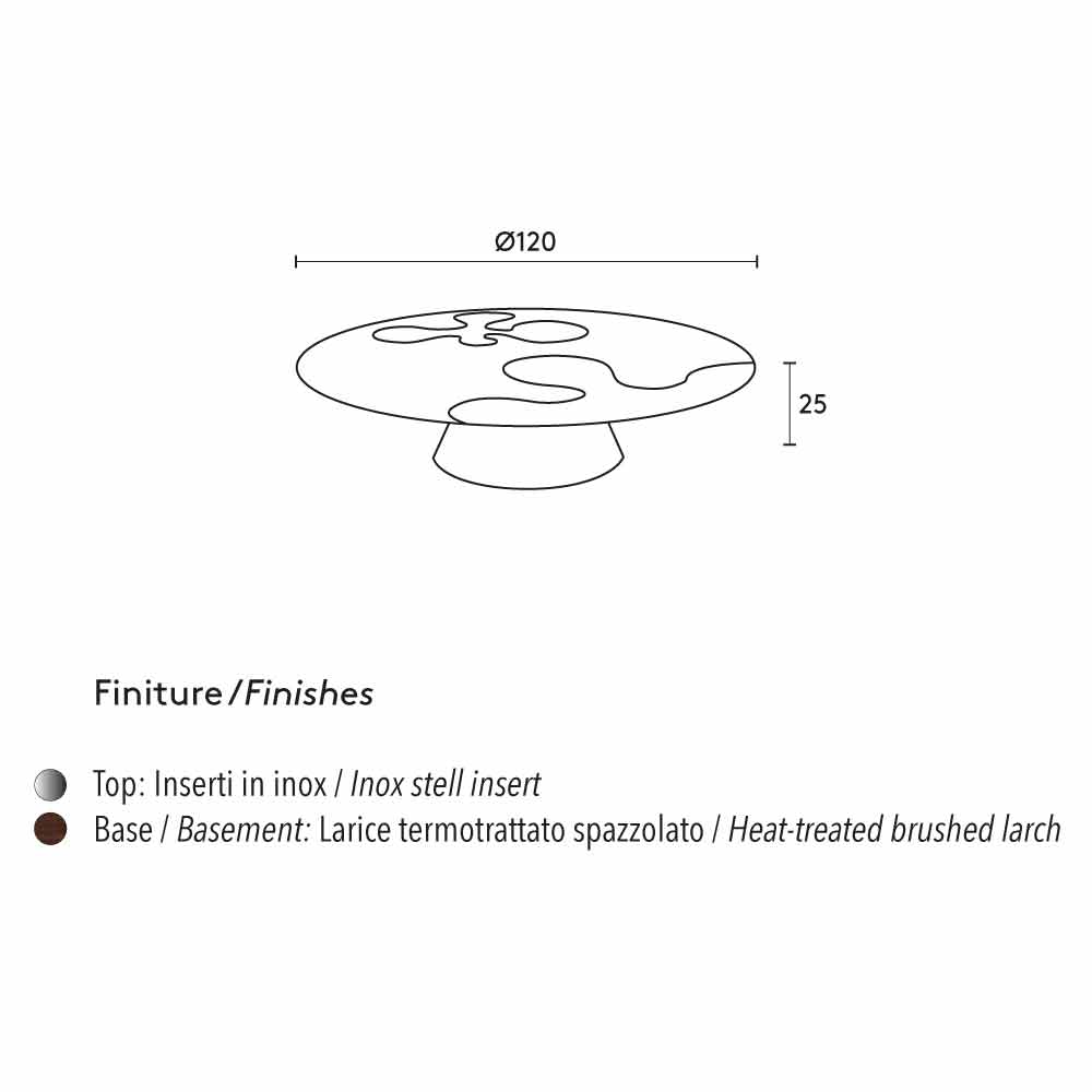 Salontafel gekenmerkt door een vloer met RVS inserts en uitsparingen. Conische Base in geborsteld lariks hitte behandeld.
