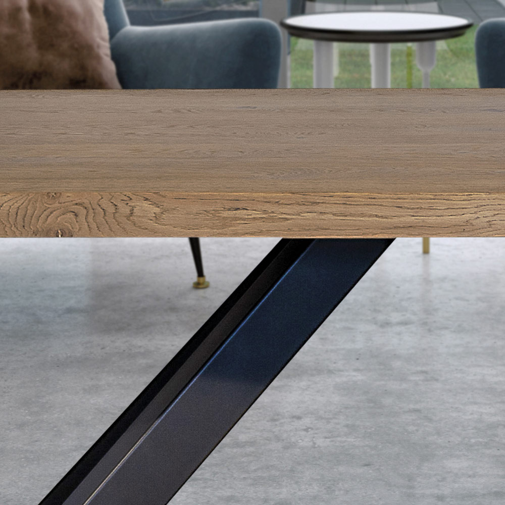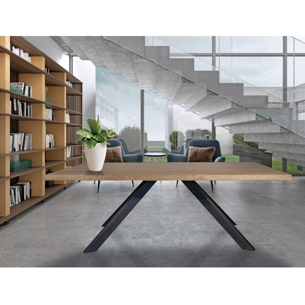 Houten tafel in ontschorst geknoopt eikenfineer en metalen onderstel Made in Italy.