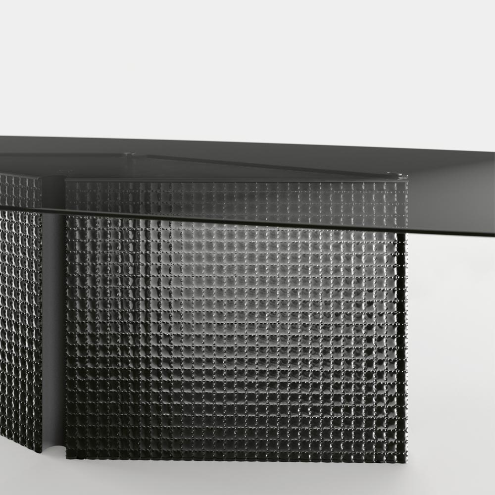 gevormd blad van gehard glas, bevestigd aan het onderstel door stalen platen en centraal onderstel bestaande uit