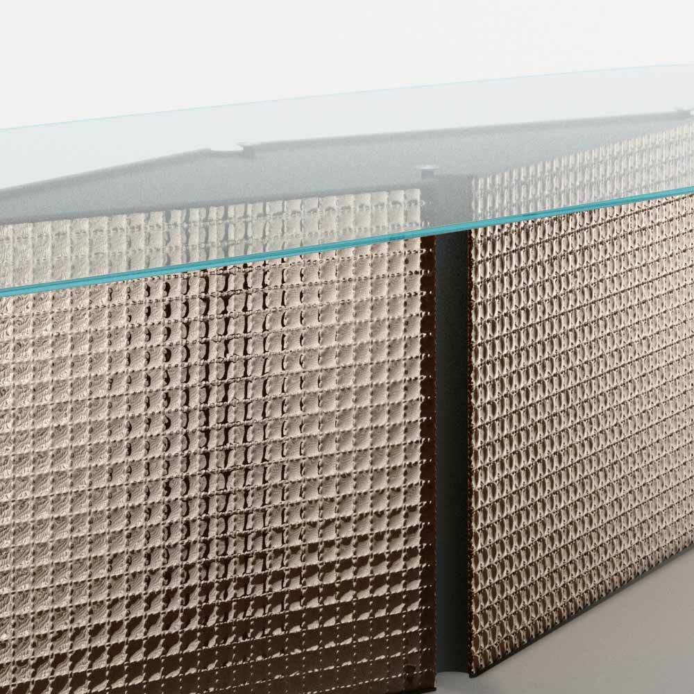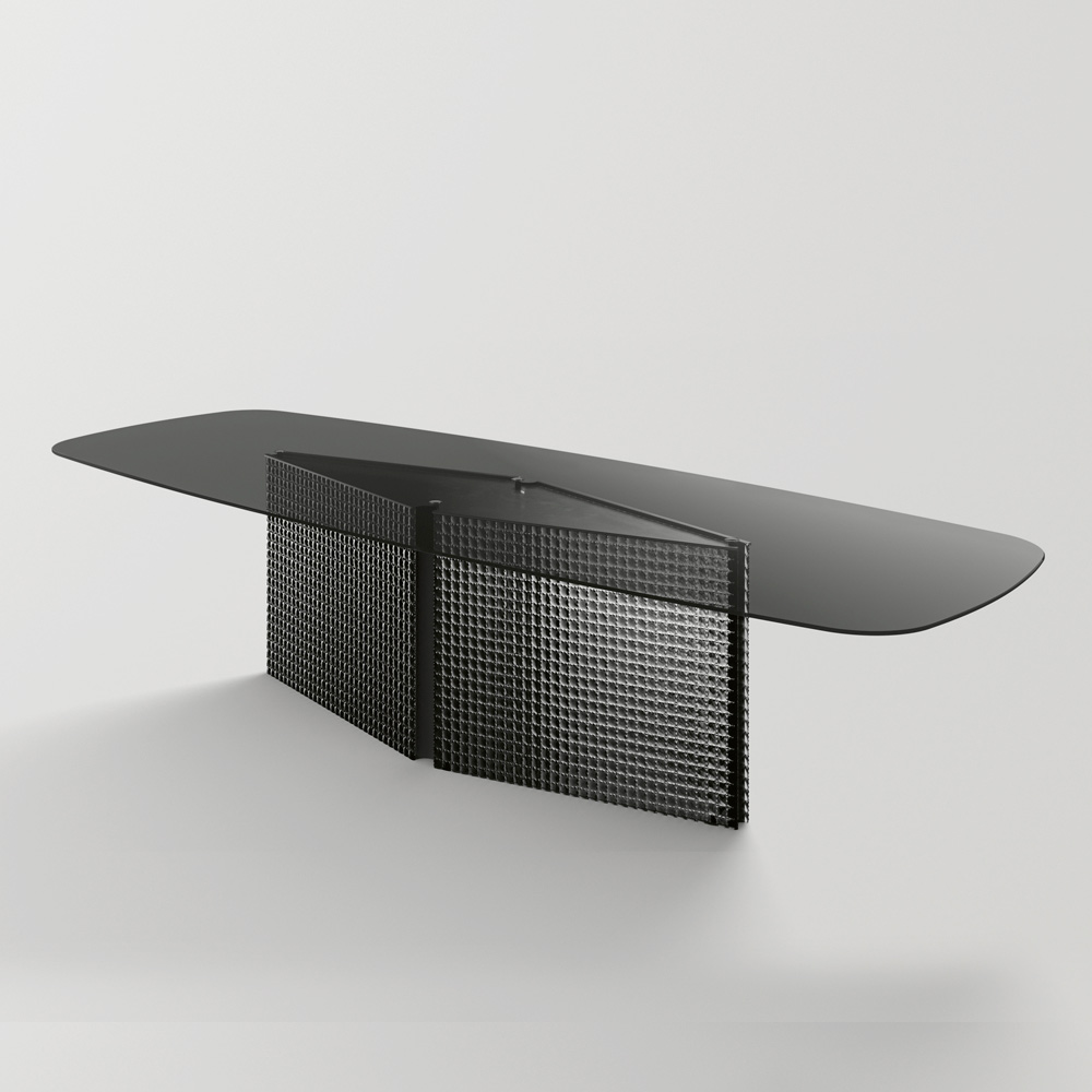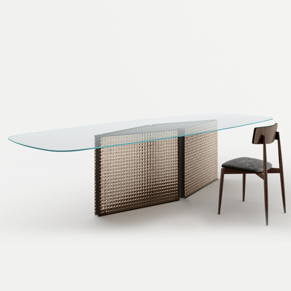 Gevormde tafel van gehard glas en onderstel van gesmolten glas