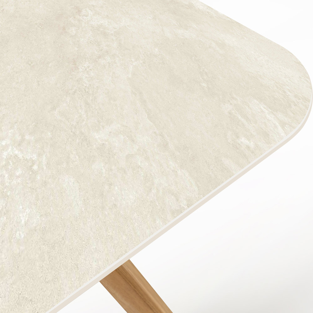 gemaakt in Italië. Deze buitentafel is een designstuk dat elke buitenruimte naar een hoger niveau tilt met zijn balans tussen natuurlijke elegantie en moderniteit. Deze tafel heeft een keramisch blad, geïnspireerd op Chianca di Ostuni -steen, bekend om zijn neutrale kleur en textuur die doet denken aan natuursteen, wat een vleugje rustieke maar toch eigentijdse stijl toevoegt.