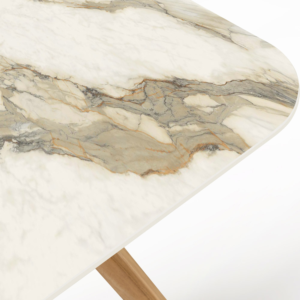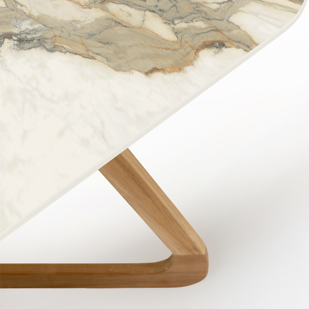 gemaakt in Italië. Deze buitentafel is een meesterwerk van design dat de kunst van keramiek combineert met het vakmanschap van hout. Het keramische blad is geïnspireerd op het prestigieuze Calacatta Hermitage marmer, bekend om zijn complexe grijsgroene adering tegen een crèmewitte achtergrond, wat een vleugje luxe en verfijning toevoegt aan elke buitenruimte.