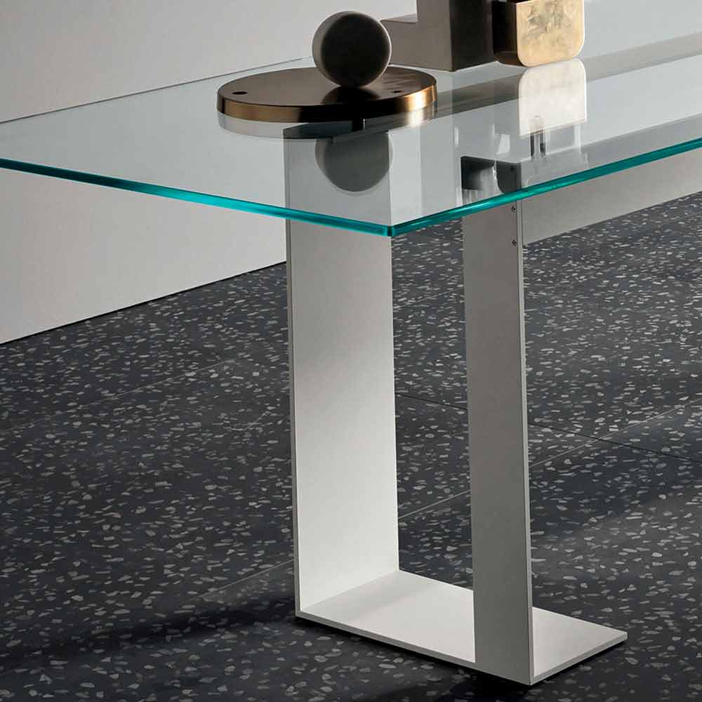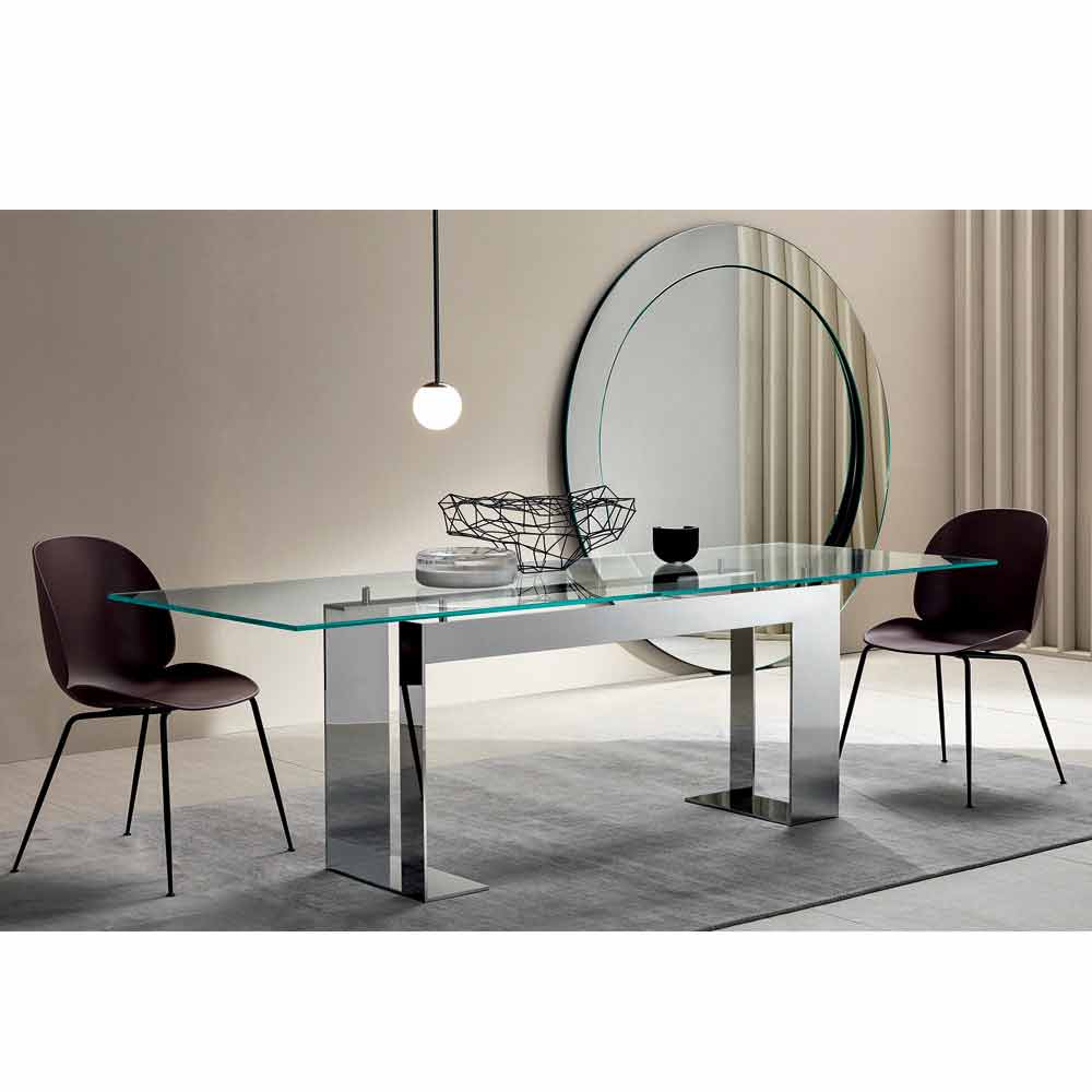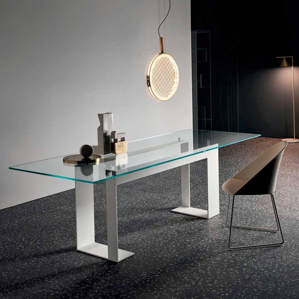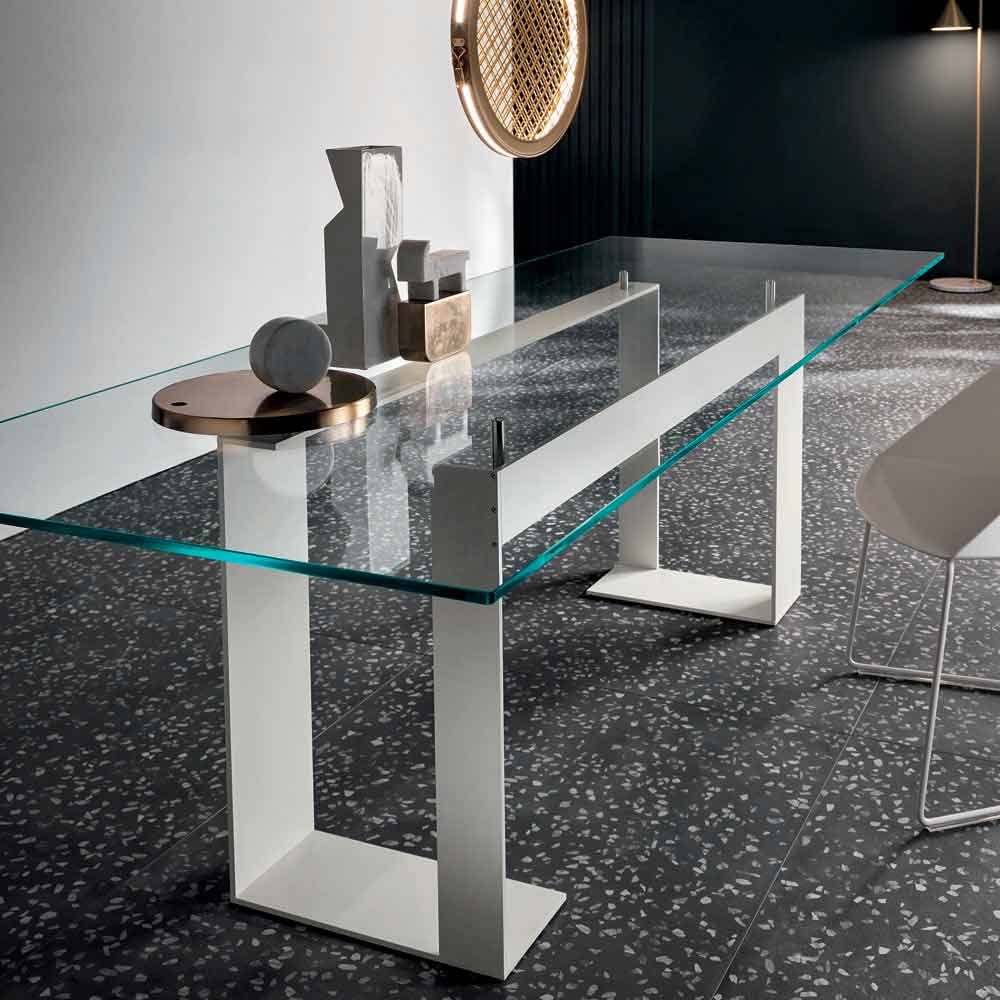 Deze eettafel heeft een extra helder blad van gehard glas dat rust op 4 steunen die hem optillen van de metalen structuur, verkrijgbaar in 3 afwerkingen en 4 verschillende maten.