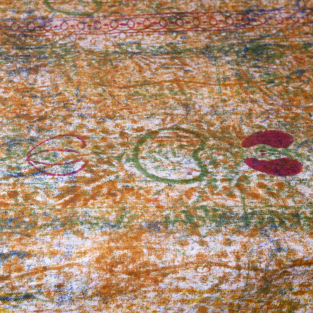 Tijdens de printfasen wordt de kleur ook gedeeltelijk overgedragen op dit onderliggende weefsel dat maand na maand verandert in een "onvrijwillig" kunstwerk maar vol kleur en charme.